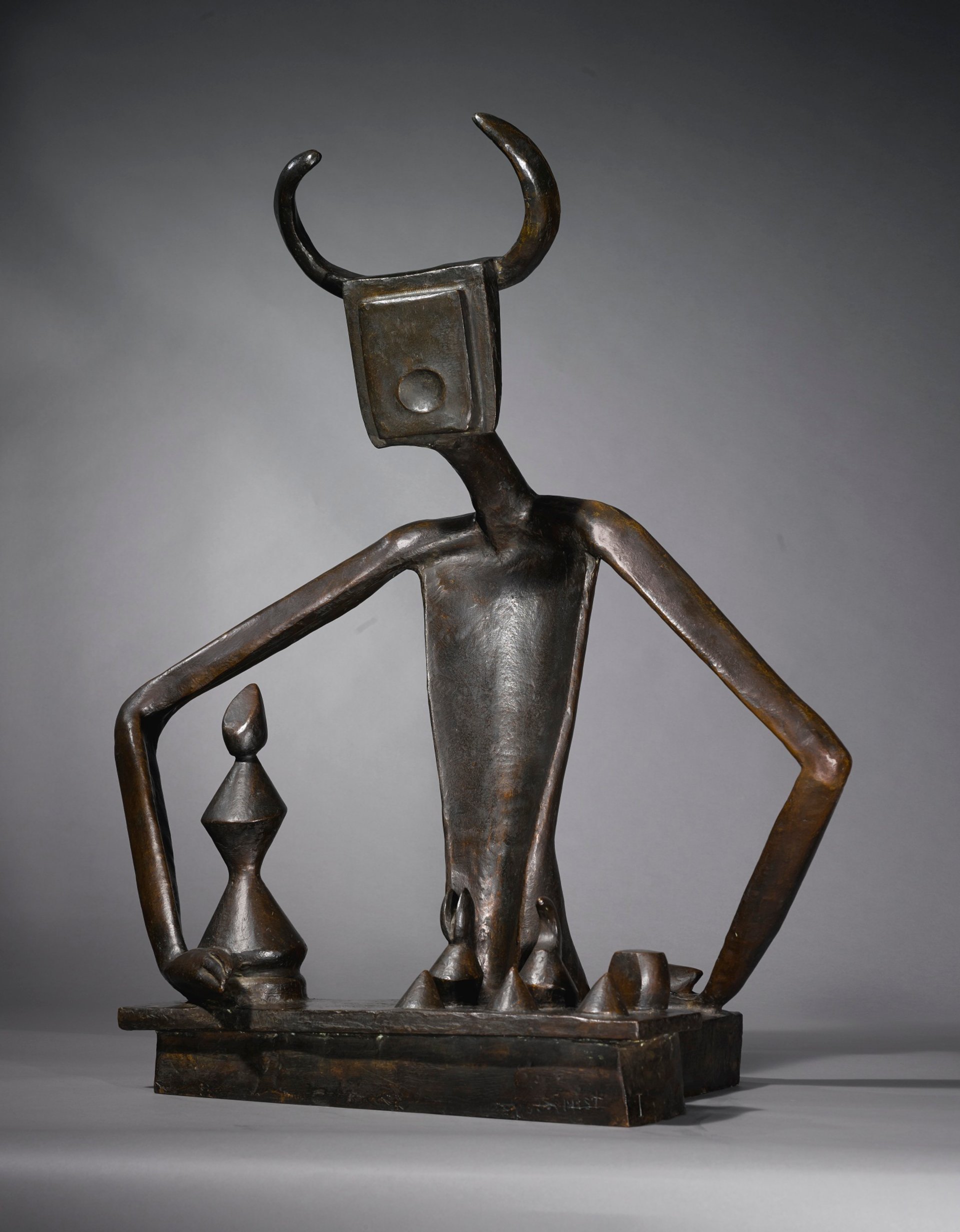 The action certainly provided a contrast to the energy during the Christie’s sale. More than once, a Sotheby’s associate leapt in with a bid just as the hammer was coming down—as with the Max Ernst sculpture from the collection of the artist Robert Motherwell. The chess-themed bronze Le roi jouant avec la reine (conceived 1944, cast in the 1950s), was the subject of shouted bids from at least 10 corners, driving the price well beyond the estimate of $4m to $6m over the course of several minutes. Chief operating officer Adam Chinn, on the telephone, swept in to claim it as Newman’s hammer came down for $14m, or $16m with fees.