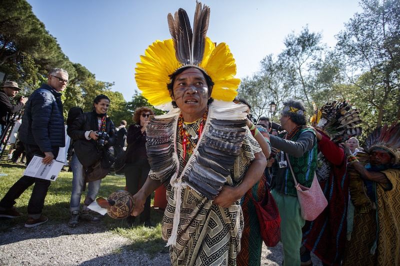 At the Arsenale, there is more of the same. The Brazilian artist Ernesto Neto’s possibly well-intentioned but deeply self-serving Sacred Place consists of a soaring jute and cotton tent which encloses a space decorated with plants, with woodchips strewn on the ground, and full of cushions for visitors to sit on. This is intended to replicate the structure of the Cupixawa, a ceremonial meeting place for the Huni Kuin Indians living in the state of Acre in the Amazonian forest. In tents such as these, they meet to drink ayahuasca, a plant-based hallucinogenic substance, which apparently enables them to connect with nature and “heal the wounds of a sick modern society”. (It is also incidentally the new favourite recreational substance of the organic hipster set.) Lest we fail to appreciate that Neto has personally engaged with this community, he has some actual Huni Kuin Indians to hand, complete with feathered ceremonial headdresses, to drive the point home. In a performance at the exhibition opening, they sit under the tent while Neto talks and then talks some more. If this project is about giving the Huni Kuin a voice, why is it the artist doing most of the talking?