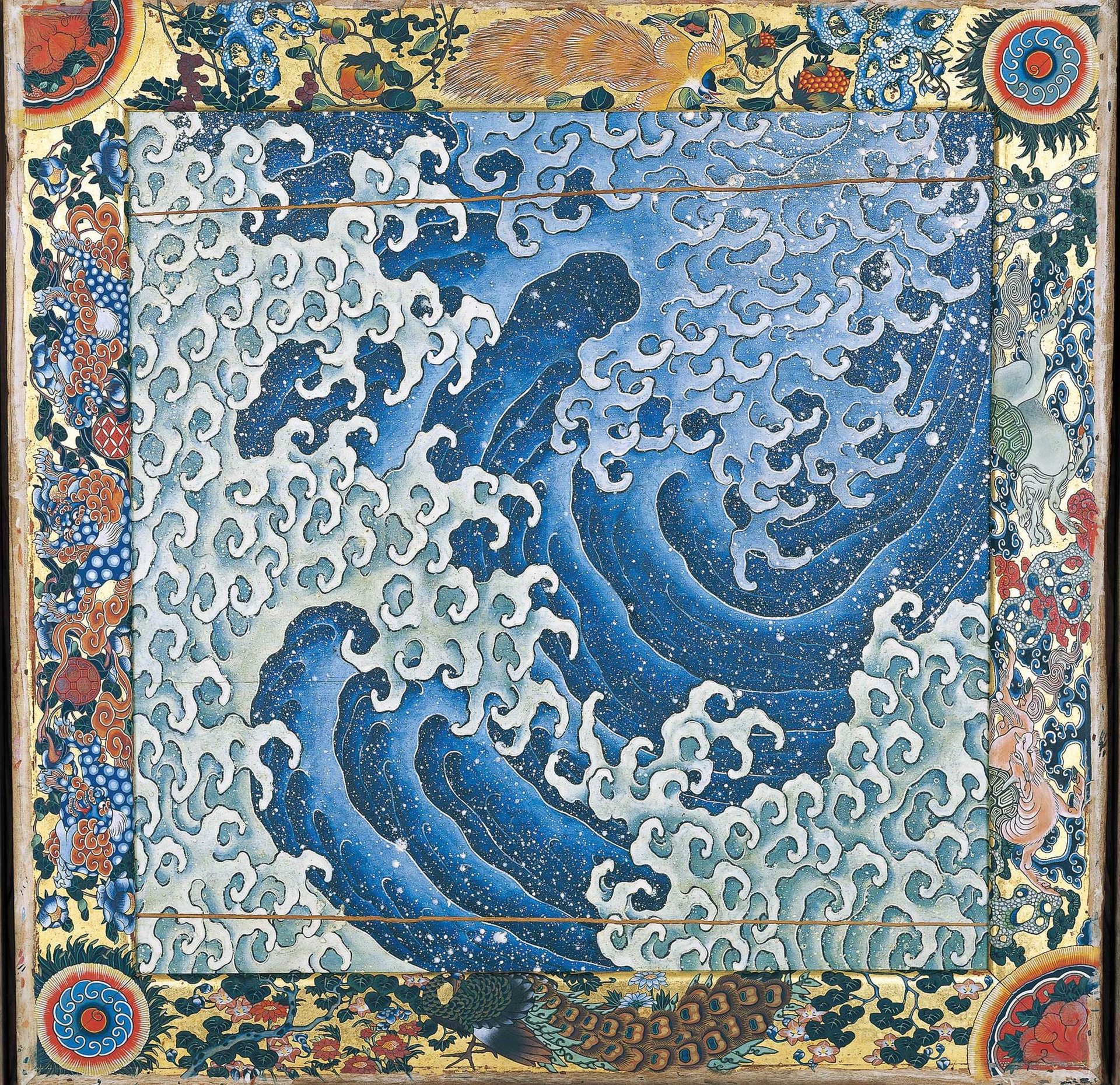 Waves (1845) This panel painting served as part of the ceiling of a cart paraded around the town of Obuse in central Japan during festivals. The centre of the work was painted by Hokusai, who also produced the design for the painted frame that was executed by Takei Kozan. Created more than a decade after The Great Wave, Hokusai’s festival panels show his continued interested in stylising water. The spiralling waves throw up white specks that dot the surface of the sea. and foam is depicted in shades of whitish blue, apparently falling into a deep blue whirlpool. Two ceiling panels, which have never been shown in Europe, will be on display at the British Museum.