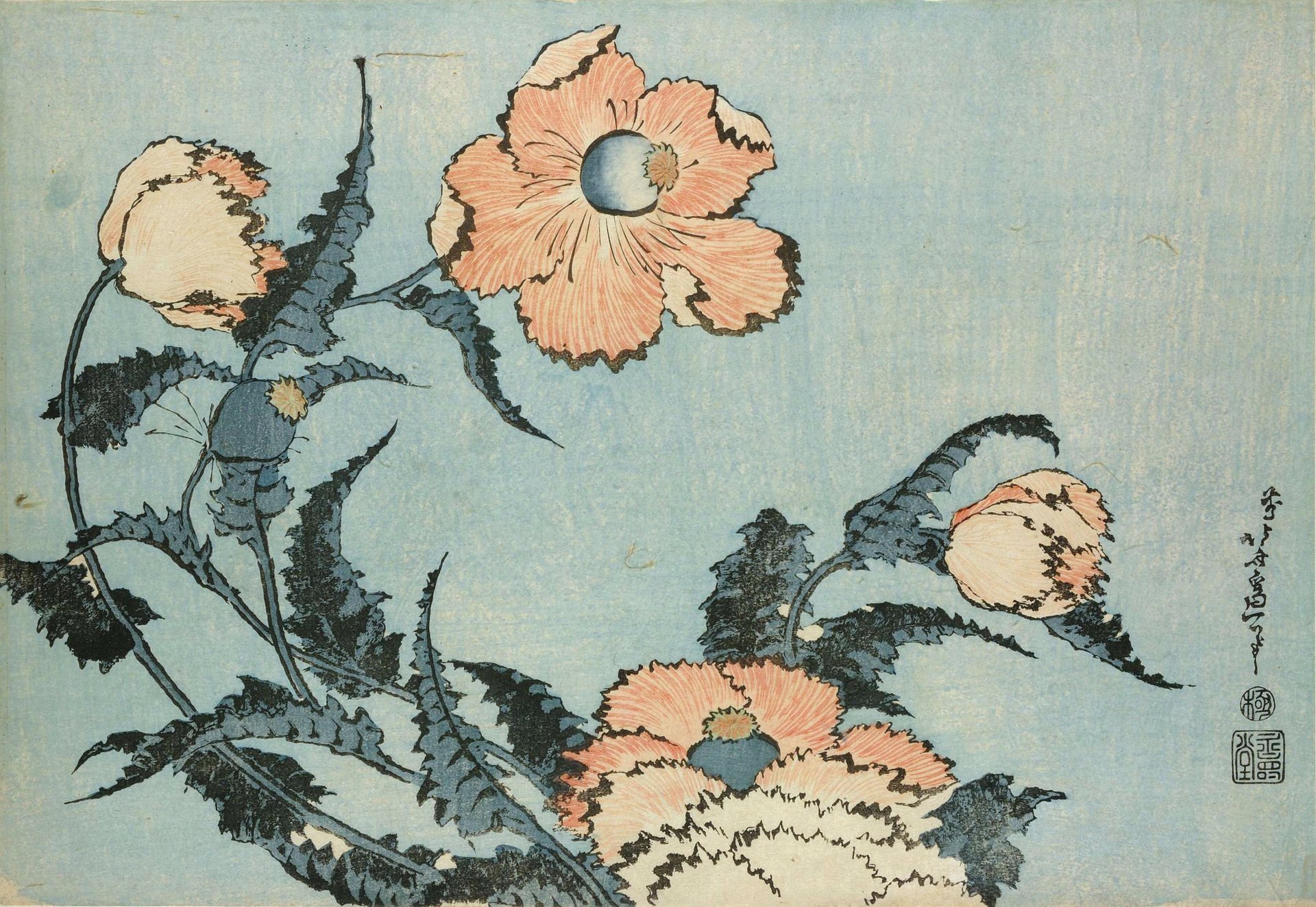 time as Thirty-six Views of Mt. Fuji. Here, the subject is not just the poppy, but also the wind that bends the flower. Stylistically, Poppies is reminiscent of the same movement that appears in The Great Wave, with the flower bending in a similar configuration as the wave. Hokusai’s brushstrokes are deliberately rough and forceful, capturing the movement of the wind.