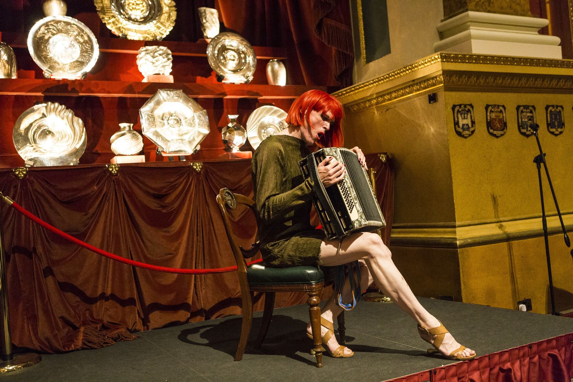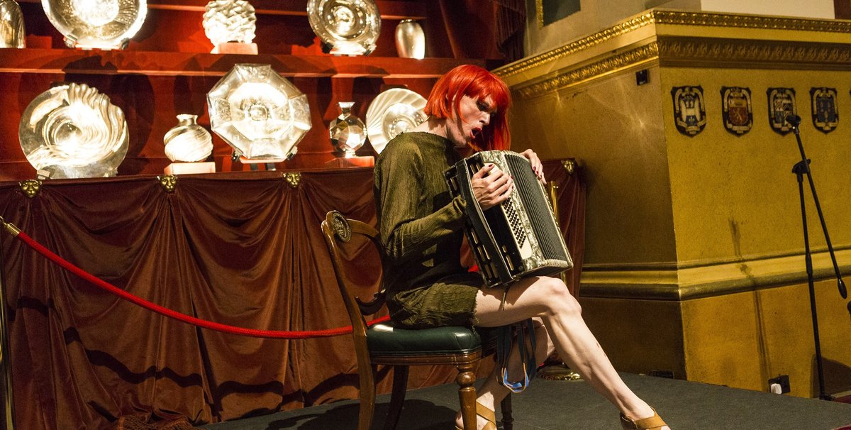 The evening’s enthusiastic belly worship was then punctuated by guest speaker Julia Peyton-Jones, who traced the seismic changes in the London art world in which Goldsmiths has played such a crucial part. There were also virtuoso interludes from current Goldsmiths music students Eleanor Rashid and Francis Devine. However, everyone agreed that the show was comprehensively stolen by the searing, passionate vocals of the fuchsia-coiffed artist and Goldsmiths alumnus Adam Christensen, who graduated in Fine Art in 2007. Christensen raised the (gilded) rafters by giving it his all, and then some, accompanied by swooping blasts of accordion. According to the Goldsmiths CCA director Sarah McCrory, the last time she heard Christensen perform was at 3am outside Bar Basso in Milan when his extraordinary sound brought all the traffic to a halt. On Wednesday, the audience and location might have been somewhat different, but the effect was certainly the same.