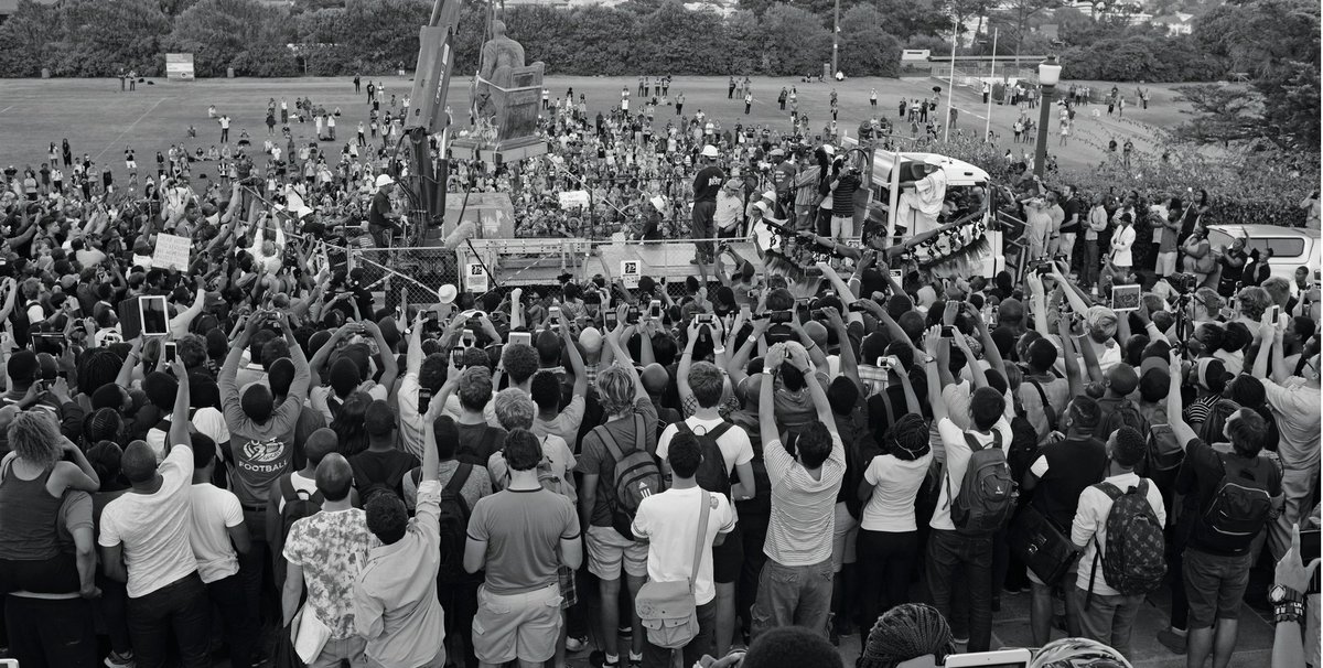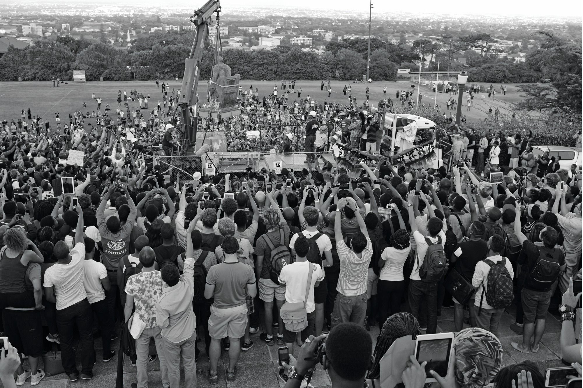 Both shows include photographs taken at the University of Cape Town during the recent student uprisings over housing, tuition and racial inequality. The protests resulted in the removal from the campus of a statue of the British colonialist Cecil Rhodes, the burning of dozens of paintings and photographs, and the covering-up of other works deemed offensive by students. This included a sculpture by the mixed-race South African artist Willie Bester of Saartjie Baartman, a Khoikhoi woman who was exhibited throughout Europe in the 19th century as an ethnological curiosity known as the Hottentot Venus.
