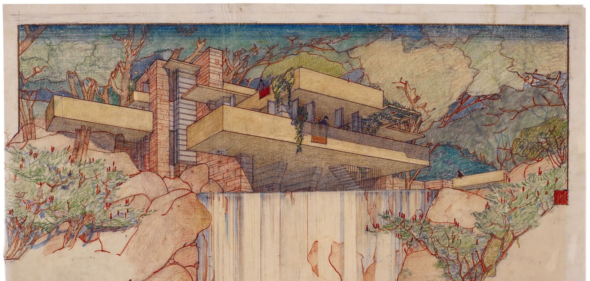 Driven by big ideas and a desire to reach nationwide audiences, Wright mastered any number of presentation techniques, from coloured pencil drawings to books, magazines, exhibitions, monographs, films, radio and television. He even appeared on the popular TV quiz show, What’s My Line? He also knew—the MoMA exhibition is very good on this—how to attract talented young assistants, some straight from high school, who, quite simply, drew beautifully. In fact, the MoMA exhibition reveals many of the set-piece Wright drawings to be the work of assistants, notably Jack Howe, known as “the pencil in FLW’s hand”, who, joining the studio in 1932 aged 19, was its chief draughtsman from 1937 when Fallingwater in Pennsylvania—one of the most renowned of all US buildings—was under construction.