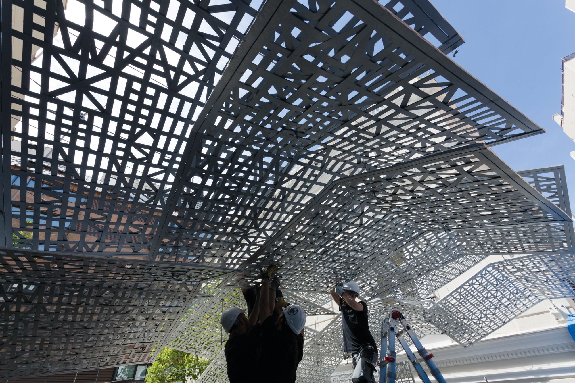 “You can’t get a group of people to lift the reclining figure up and move it. But we were just able to lift up the plywood profile and move it around. Moore came for that. So Moore just placed it in the landscape. No-body had thought about a plywood cut-out.” Foster’s innovative use of materials has rubbed off on Iglesias, who has used carbon fibre for the first time to create her sculptural installation suspended over the entrance courtyard. Foster recalled quizzing Moore about colours in the landscape. “He was terrific. He said that if you want something to recede, use a dark colour, like the colour of the trunk of a tree. I’ve applied that lesson as an architect,” Foster says.