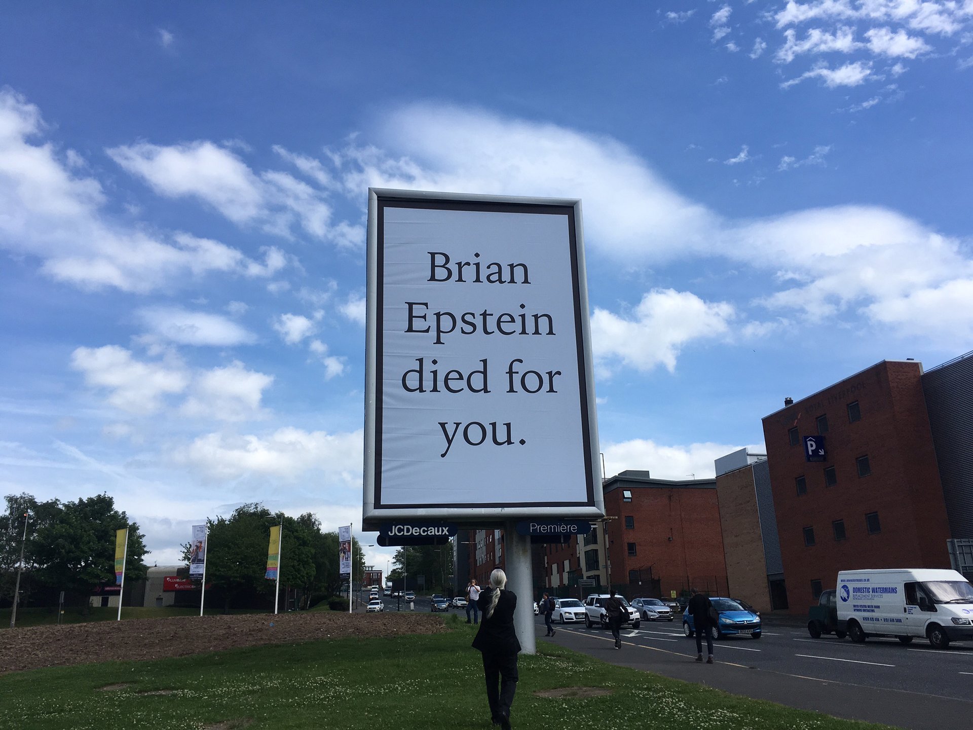 Meanwhile, Jeremy Deller has produced a series of signs and billboards in prominent locations around Liverpool declaring: “Brian Epstein died for you”. “Our debt to him is huge”, Deller says of Epstein, who discovered The Beatles and became their manager, as well as a close friend. “I grew up with the band, and I’m mildly obsessed with [Epstein]”, Deller adds.