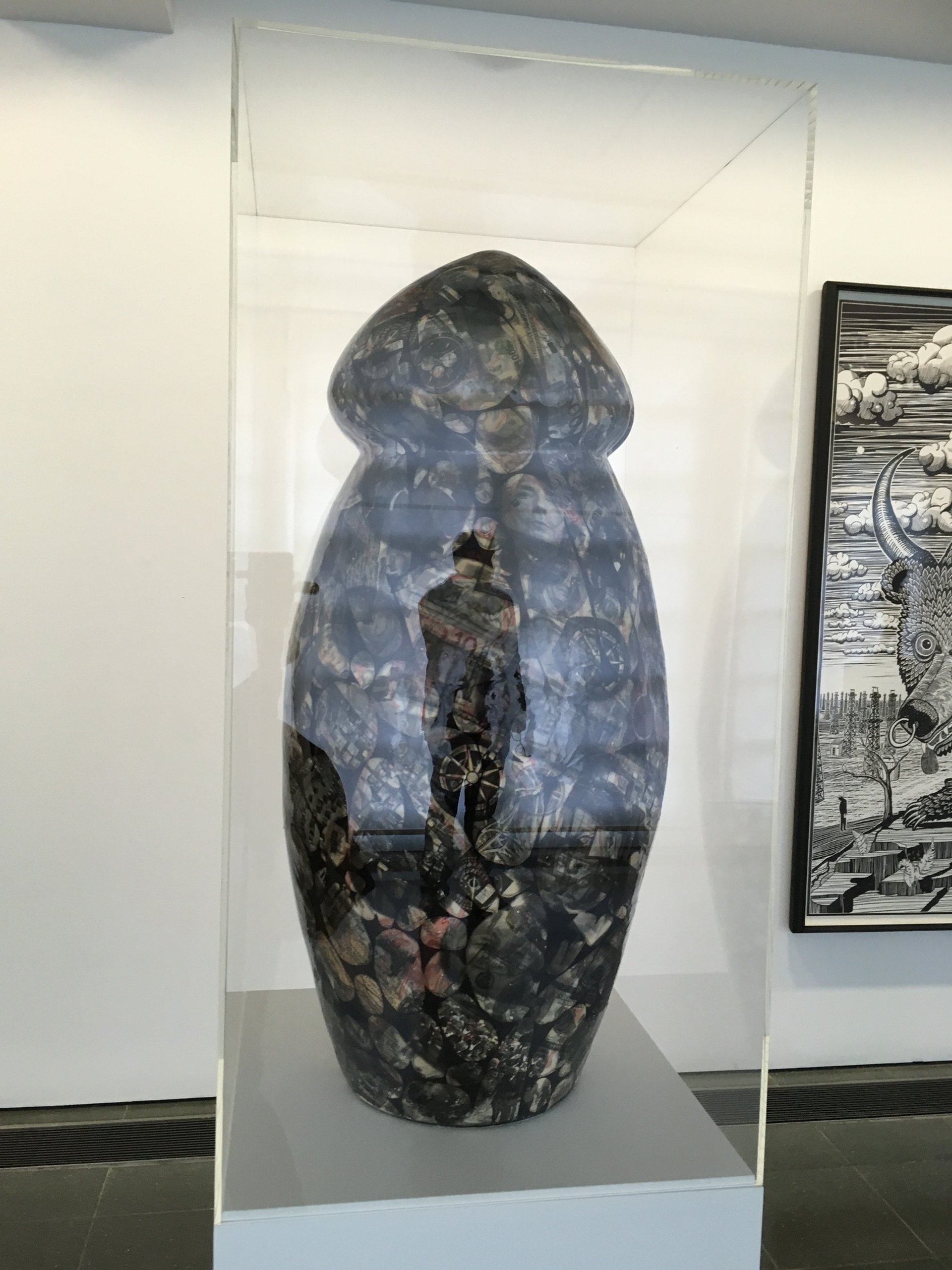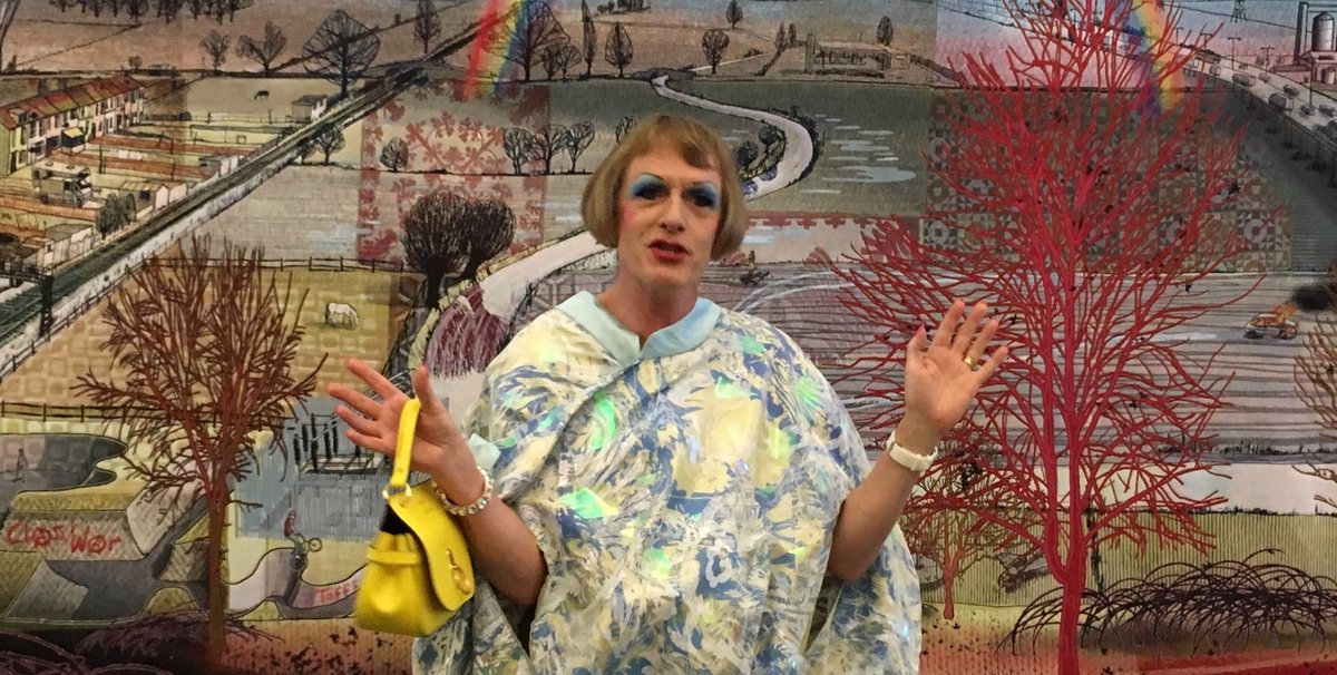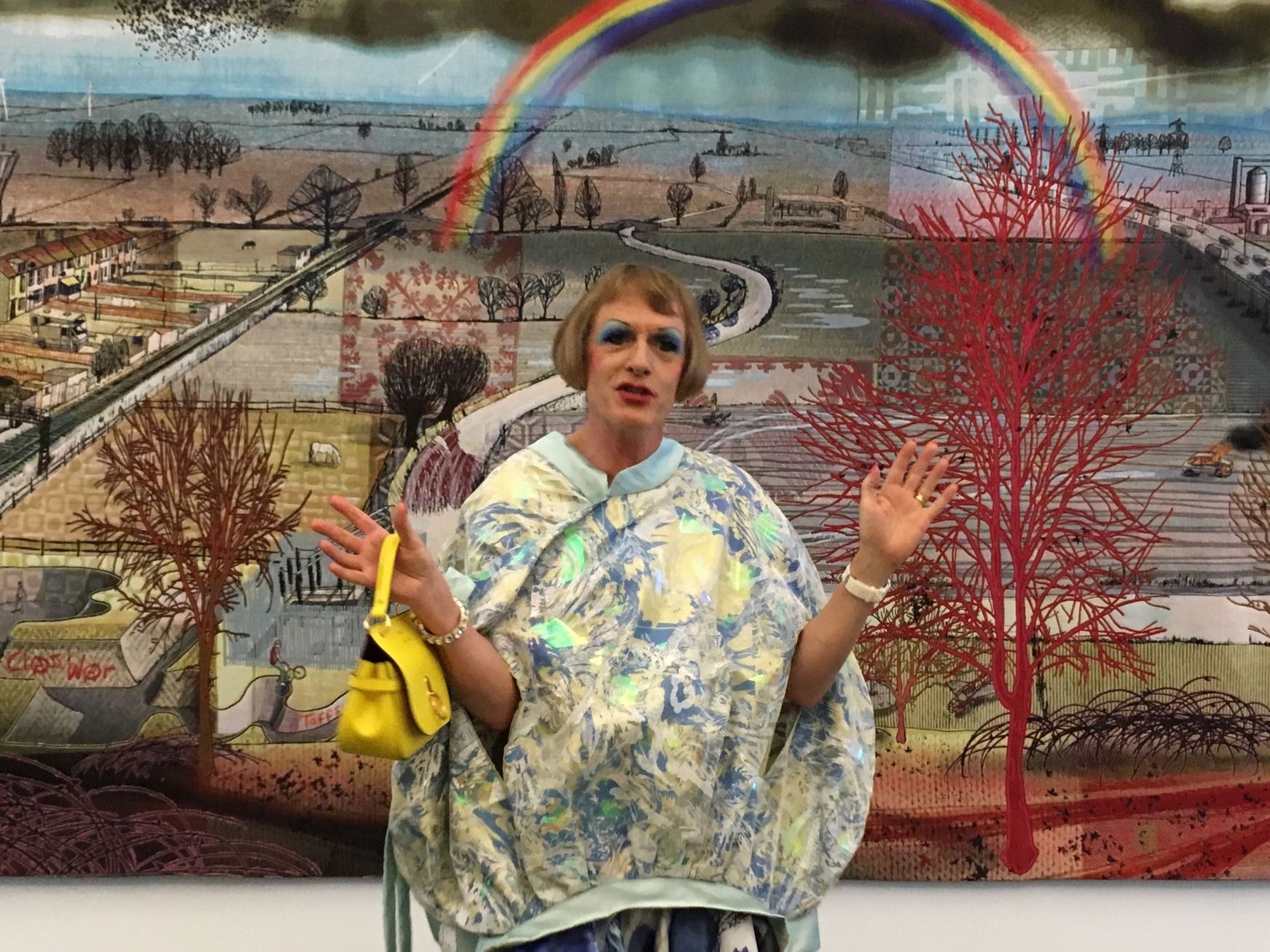Resplendent in a diaphanous blue frock, gold peep-toe platforms and clutching a canary yellow handbag donated by the show sponsors Mulberry—which he said made him feel “like a gnarled 57 year old Alexa Chung”—the world’s most famous transvestite potter whipped the well-heeled crowd of Serp patrons on a whirlwind personal tour of the galleries. Pausing in the West Gallery or—as he dubbed it, “the Man’s Room”—Perry indulged in a bout of good natured banker-baiting. He described the finance sector as the most visually arid and emotionally repressed community he had surveyed during his recent All Man televsion series for Channel 4 and summed up his giant phallic ceramic Object in Foreground (2016), which also resembles the City’s Gherkin building, as “just another bland sculpture for all those the bland city lobbies”.
