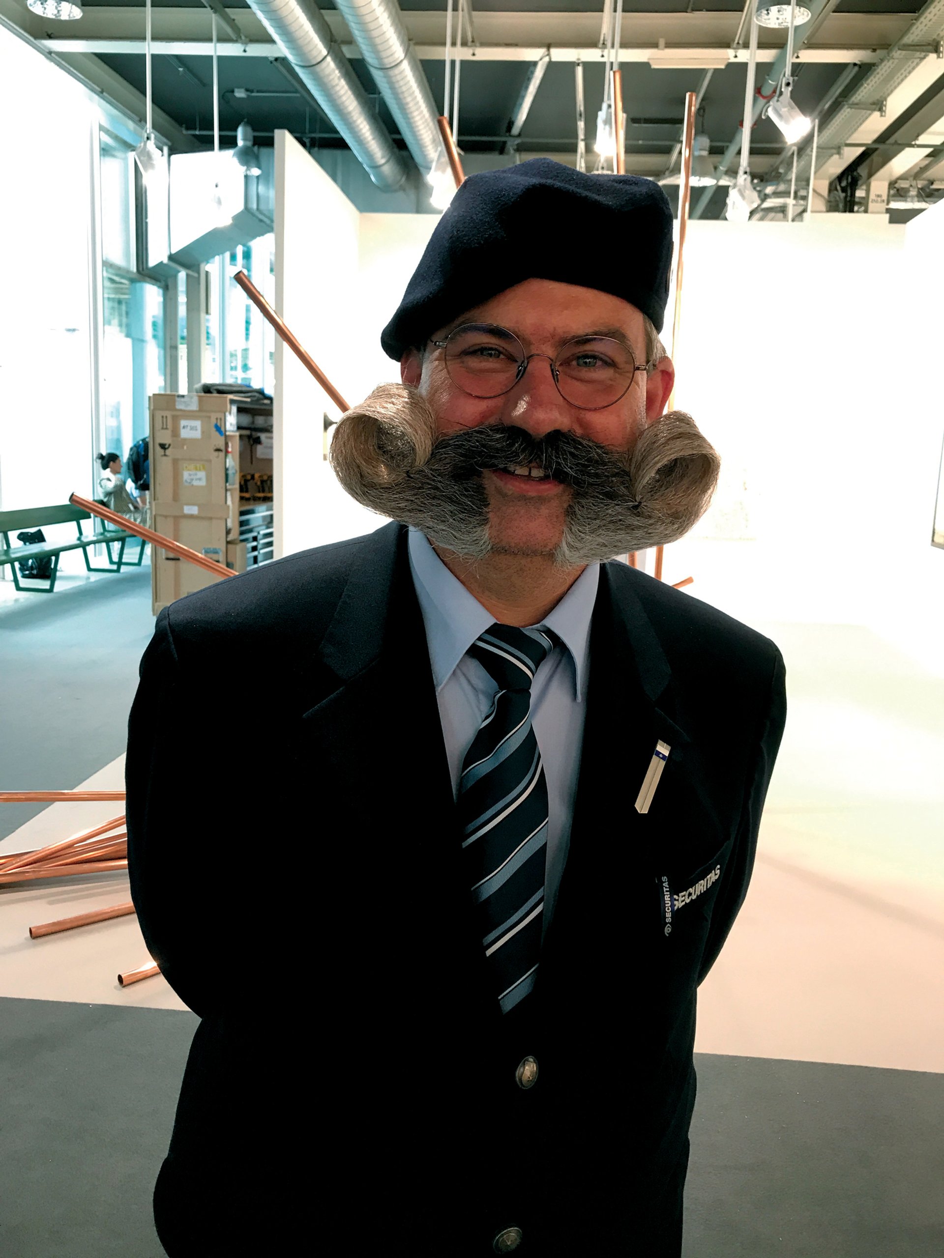 Basel’s beardy champion Visitors to Art Basel may not be aware that there is a champion moustache-grower in their midst. Hervé Diebolt, one of the fair’s many diligent warders, won second place in the “freestyle moustache” category of the ultra-competitive World Beard and Moustache Championship in Schluchsee, Germany, in 2014. The moustachioed Messeplatz employee says he has been cultivating his wondrous whiskers for “five or six years”—his facial hair is now around 50cm long. We wish Art Basel’s hirsute hero victory in his next battle of the beards.