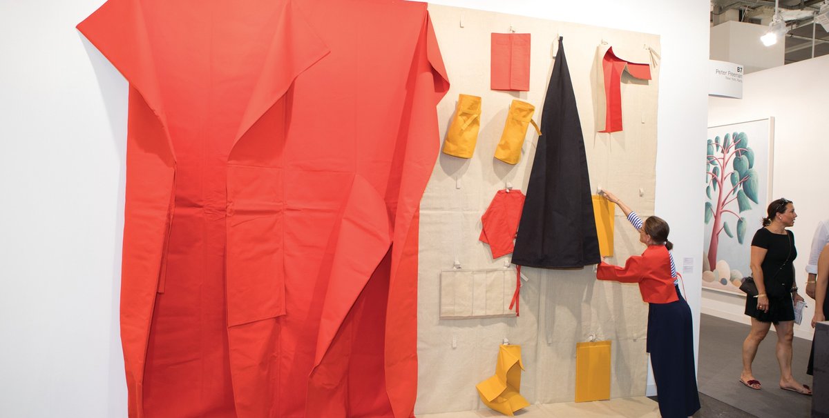 Many dealers were profiting from their artists’ visibility this spring. Daniel Buchholz had sold several abstract C-prints by Wolfgang Tillmans, whose Tate Modern show has just closed and whose retrospective at the Fondation Beyeler has just opened, at €60,000 apiece, as well as a painting by Anne Imhof featuring the artist Eliza Douglas menaced by a Molotov cocktail (à la Faust, her Venice Golden Lion-winning performance piece), acquired by a New York-based collector for €55,000. Peter Freeman, which represents Franz Erhard Walther, placed an important 1980s interactive fabric wall piece that the director Jayne Johnson described as “like relational aesthetics before that existed”.