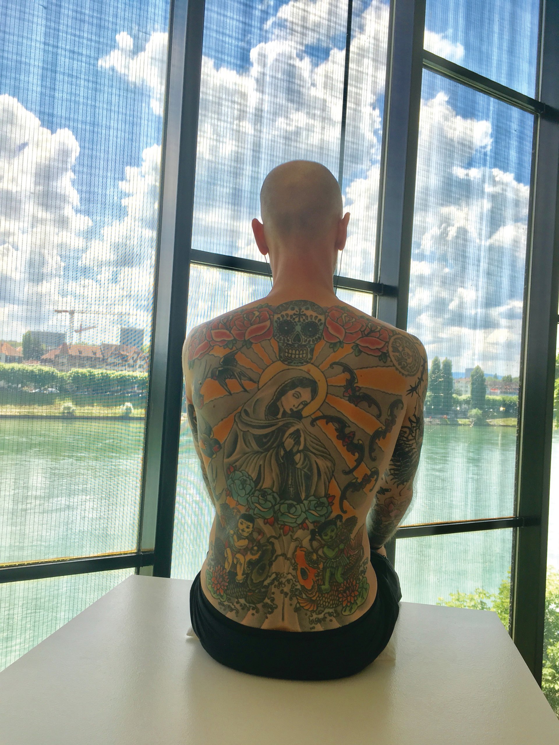 All inked up with nowhere to go During Art Basel week, visitors to the Museum Tinguely’s Wim Delvoye exhibition have a privileged view of the Belgian artist’s living canvas: Tim Steiner, the Swiss man whose back bears an elaborate Delvoye tattoo. Tim (2006-08) currently belongs to a German collector and will be removed, preserved and framed after Steiner’s death. “The work is Wim’s; I’m just the frame,” declares Steiner, who insists that his regular appearances at galleries worldwide are “absolutely not performance art—I just go where the tattoo goes”. But sitting motionless on a plinth for hours on end isn’t as easy as it looks. “It’s like going into combat every day,” Tim says. “I’ve had every job imaginable but doing nothing is the hardest thing I’ve ever done.”
