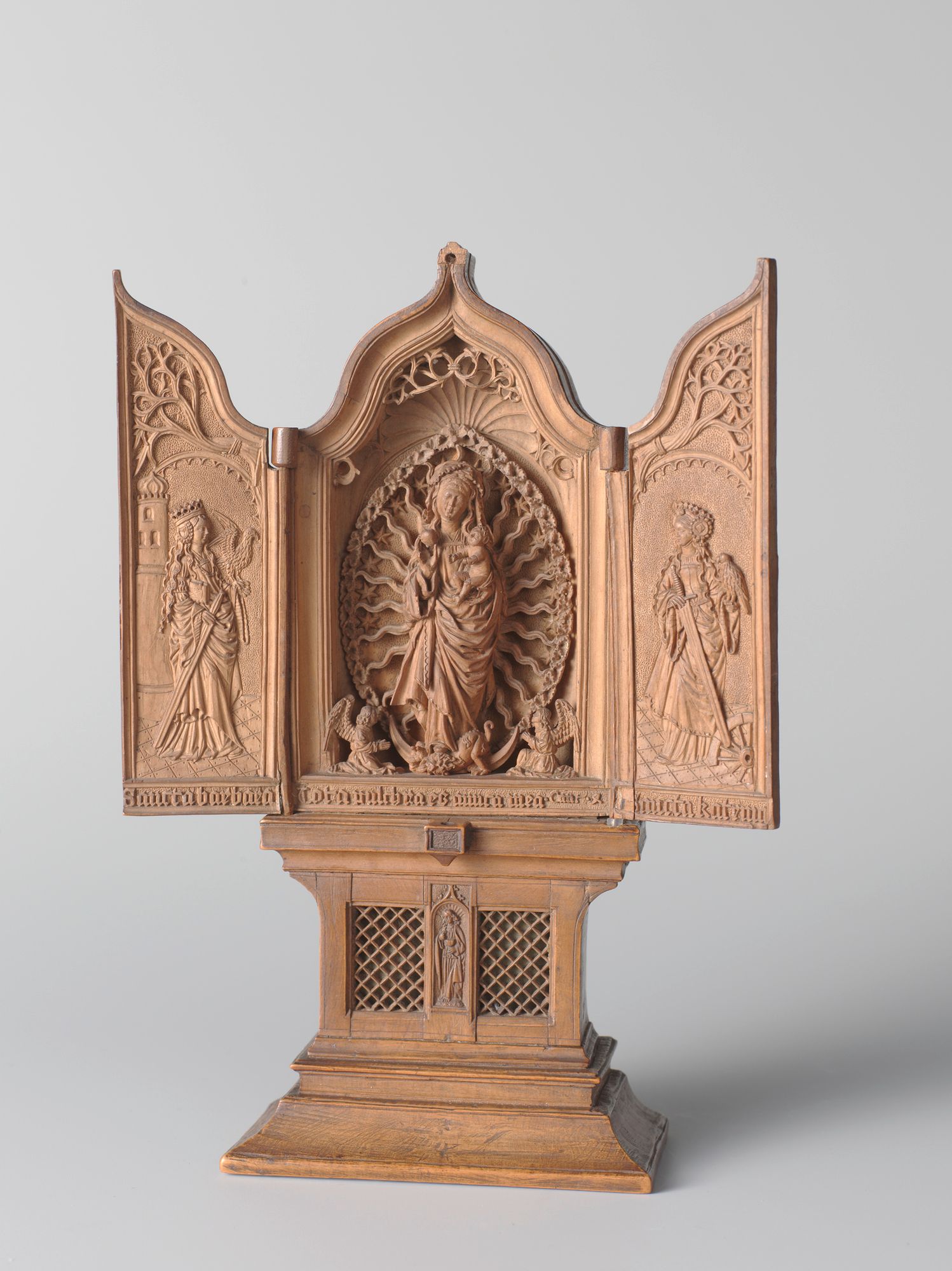 Expertly carved from boxwood, these micro-carvings, some of which are just 25mm in diameter, take the form of prayer beads (also known as prayer nuts), altarpieces, shrines, skulls and coffins. Religious scenes decorate these microsculptures, which were used as devotional or contemplative objects. The scenes are often wonderfully complex, allowing the owner to discover something new each time they looked at the object. Frits Scholten, the curator of Small Wonders, says the act of looking at and trying to identify the biblical stories depicted in these miniature sculptures is like a small pilgrimage in itself. "It's a pilgrimage of the eye." His aim is to show the breadth and virtuosity that went into the creation of these works and stress their playfulness.
