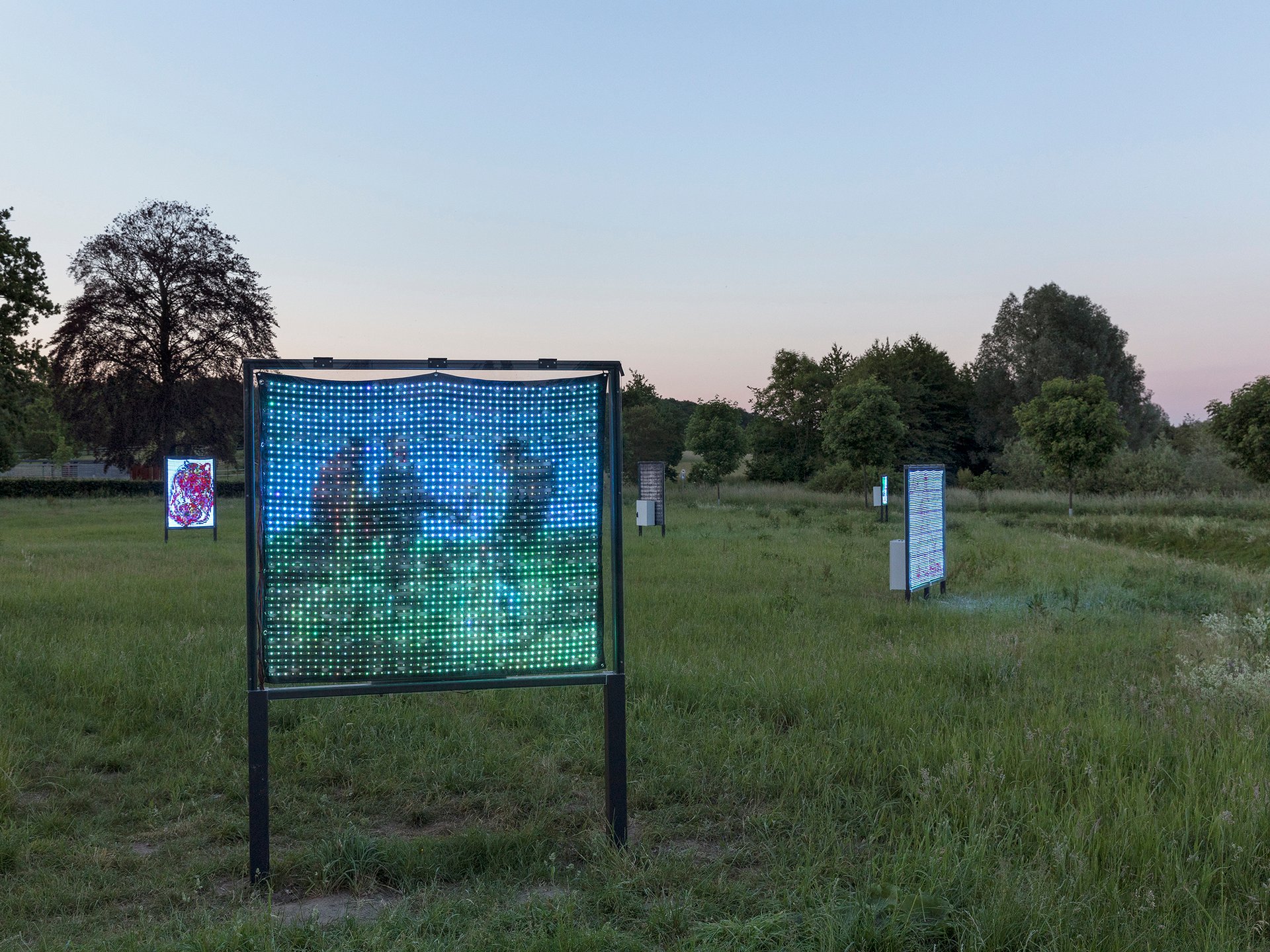 According to the Sculpture Projects Münster website: “[Arakawa] has personally grouped seven pixelated LED panels he assembled himself on the grassy space… these illuminated pictures accompanied by sound are arranged like an audio-visual choir in the landscape.” The panels depict animated versions of paintings by artists such as Joan Mitchell and Gustave Courbet.