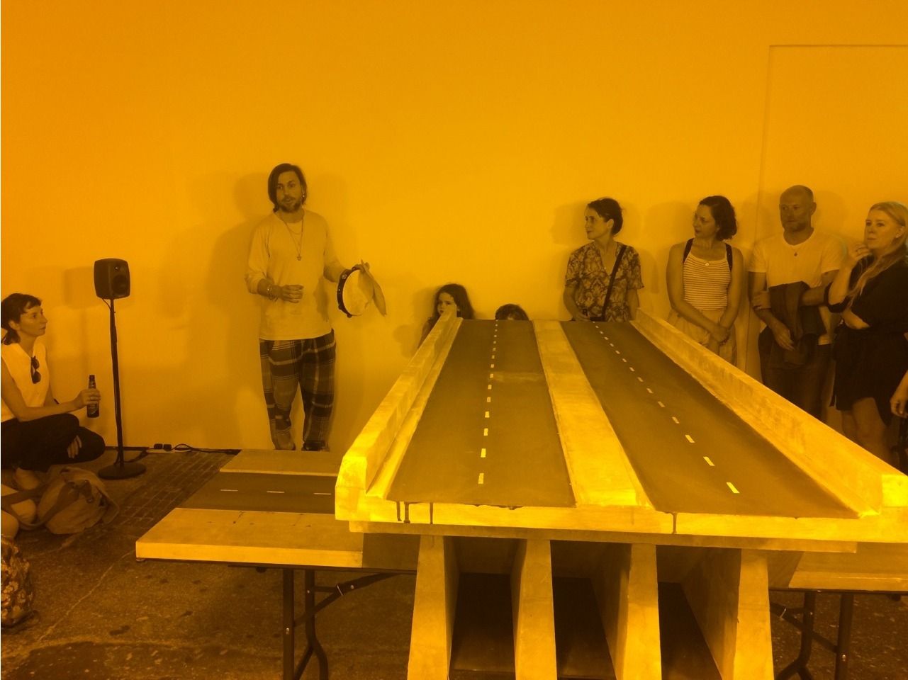 Bathed in the Lucozade-yellow of sodium streetlights, the packed PV crowd enthusiastically belted out Leckey’s poetic tirade that aims to exorcise the demons of a concrete motorway bridge on the M53, which has also been lovingly recreated in model form at Cubitt.