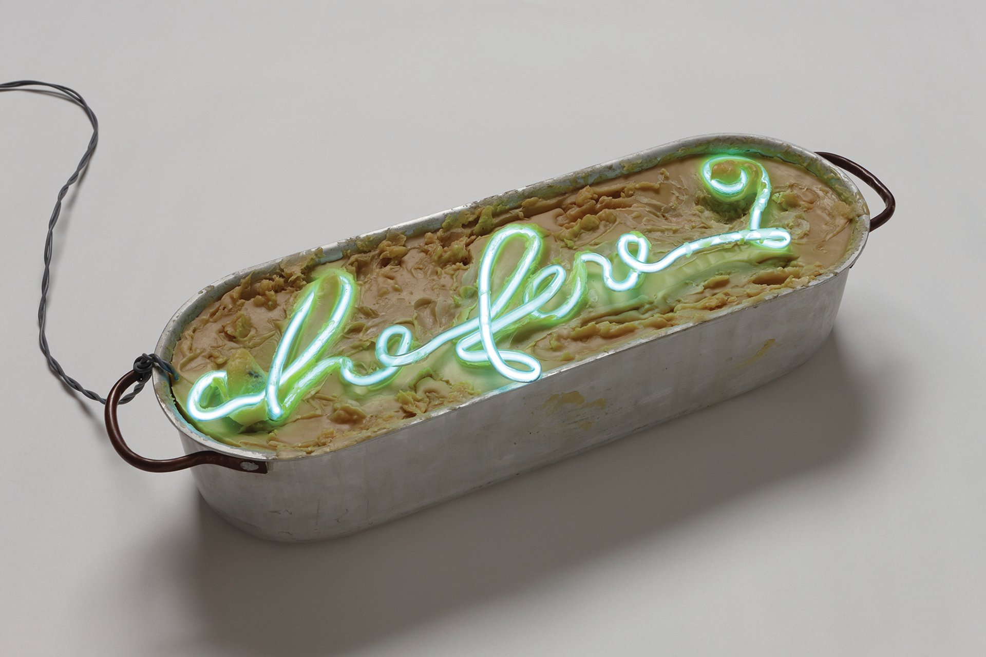 The neon sign across this aluminium pot filled with wax poses the existential question “What is to be done?”, a phrase possibly borrowed from Lenin, which recurred throughout Merz’s work after 1967.