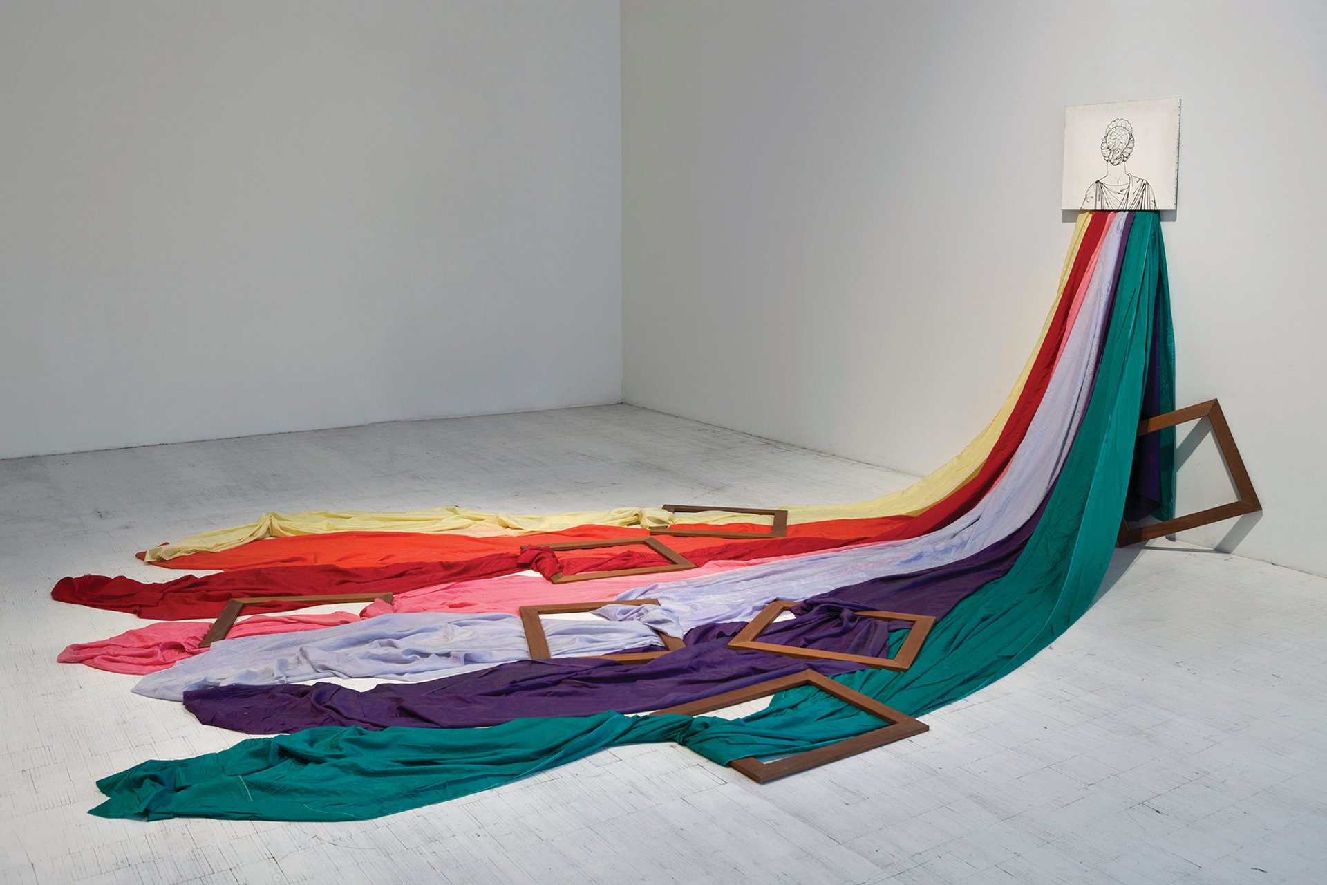 This canvas of a female head seen from behind, with seven pieces of vivid fabric streaming from her shoulders, refers to the Greek myth of Psyche, who was condemned not to look upon the divine beauty of her husband, Cupid.
