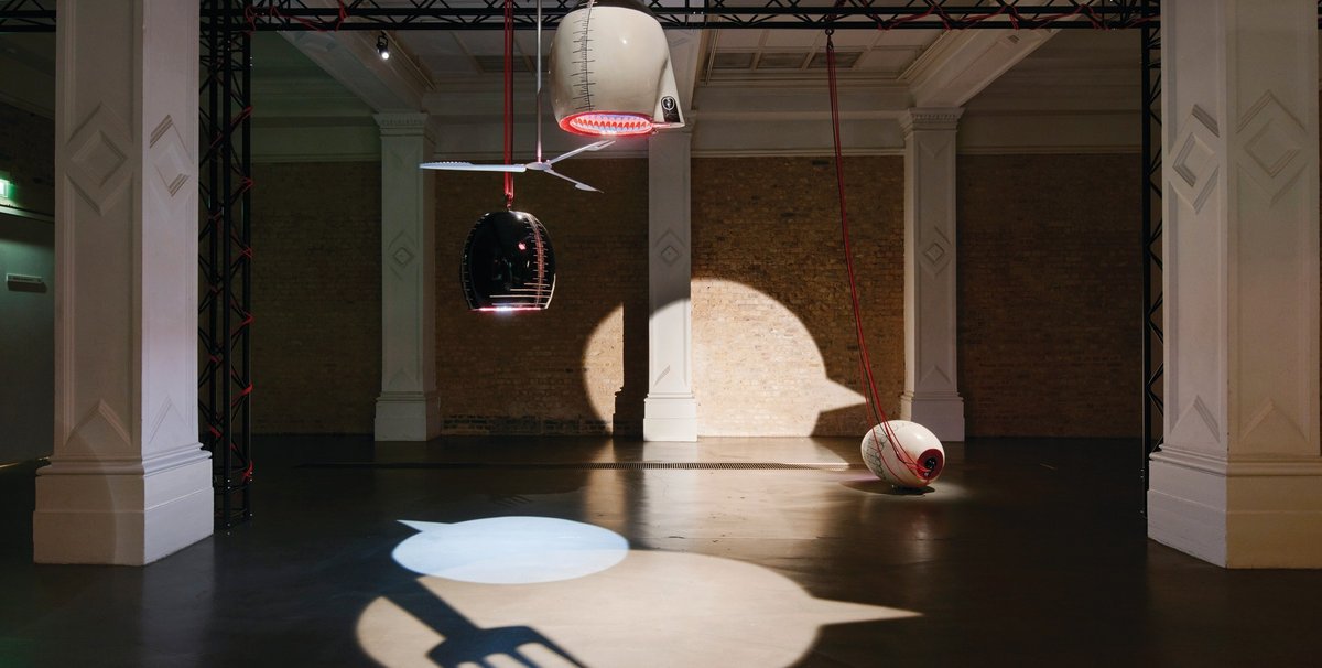 The result, she says, is both a single sculpture and a “family of objects”. Ceramic lamps hang on red ropes from scaffolds crisscrossing the darkened gallery, each one a cartoonish head severed below the nose to project a speech bubble spotlight on the floor. They can also be read as inverted jugs, scored with measuring markings. Whirring ceiling fans with blades of cutlery cast ominous shadows over their silent conversation.