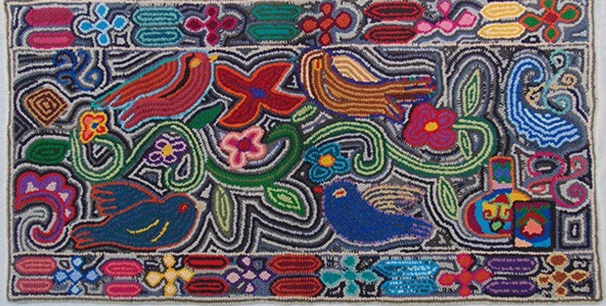 No less contemporary are the tweaked traditions found in hooked rugs by the Cooperativa de Alfombras de Mujeres Maya, based in the highlands of Guatemala. Using recycled t-shirts, sweatshirts and other garments discarded by Americans, the 50-plus women in the cooperative draw on centuries-old indigenous motifs to create dazzlingly patterned, large-scale rugs. Each renders her own interpretation of the various flora and fauna such as birds, turtles and fish.