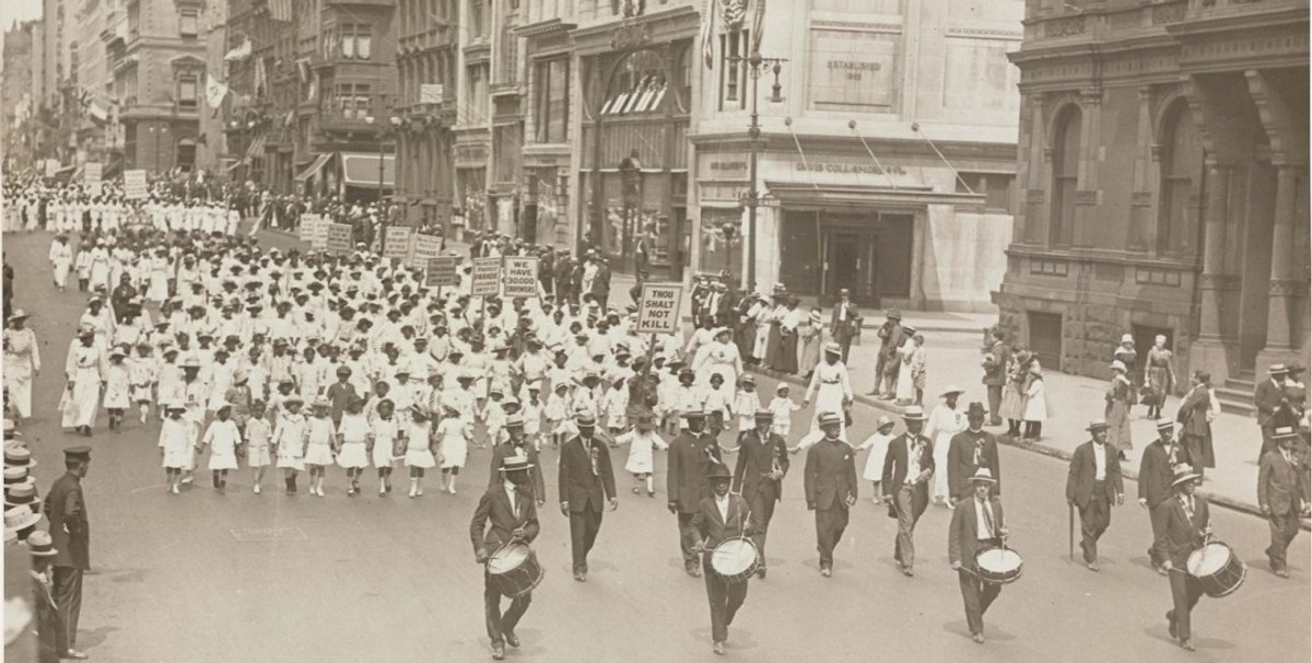 The 1917 demonstration, organised by W.E.B. Du Bois and the NAACP, happened in the wake of the East St Louis riots in Illinois, where mobs of white men murdered somewhere between 40 and 200 African Americans with little to no police intervention (the exact death toll is unknown). The mob also caused substantial property damage, displacing nearly 6,000 African American residents in the city.