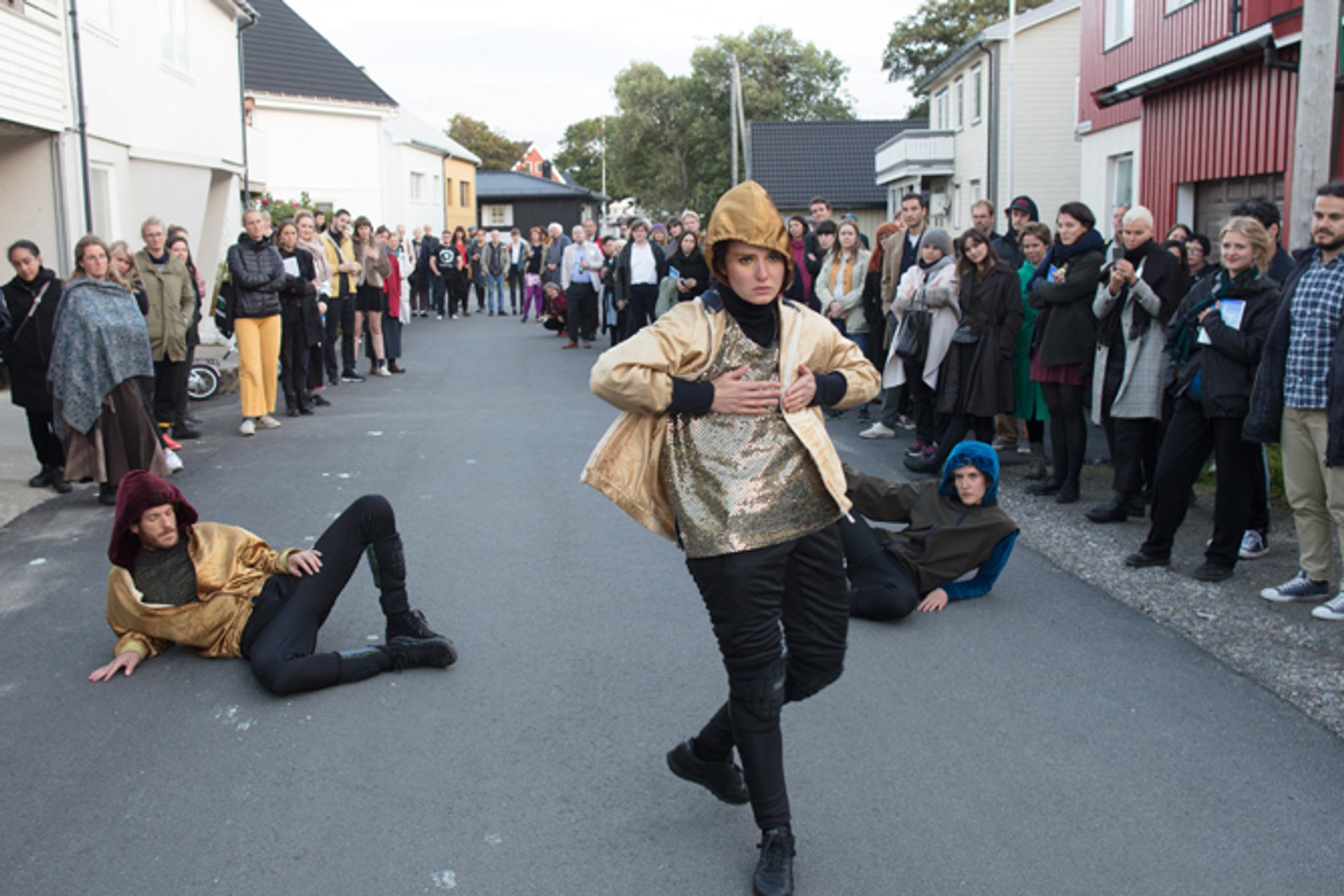 Shown as both a film and as a live performance, Liquid Power has No Shame explores gender and sexuality.Three performers lead visitors through the streets of Henningsvær conducting what could almost be described as a mating dance, eventually stopping at a rocky vantage point. The movements draw a strong contrast to the surrounding streets of the small fishing village yet have a pied piper effect as local residents and those attending the opening of the festival follow alike.