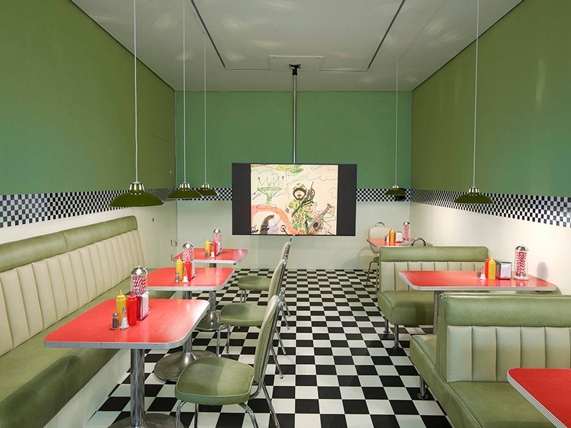 It is something of a shock to enter a south London not-for-profit to discover that it has been meticulously transformed into an authentic American diner. Matters become still more discombobulating when, in a video playing amidst the red vinyl seating and formica tables, this same diner appears as the interior of an alien space ship. Diners as spaceships, aliens disguised as Iraqi soldiers and a darkened room occupied by a mysteriously hovering hamburger are just some of the parallel universes conjured out of Al Qadiri’s childhood spent in 1990s Kuwait and revisited here two decades later.