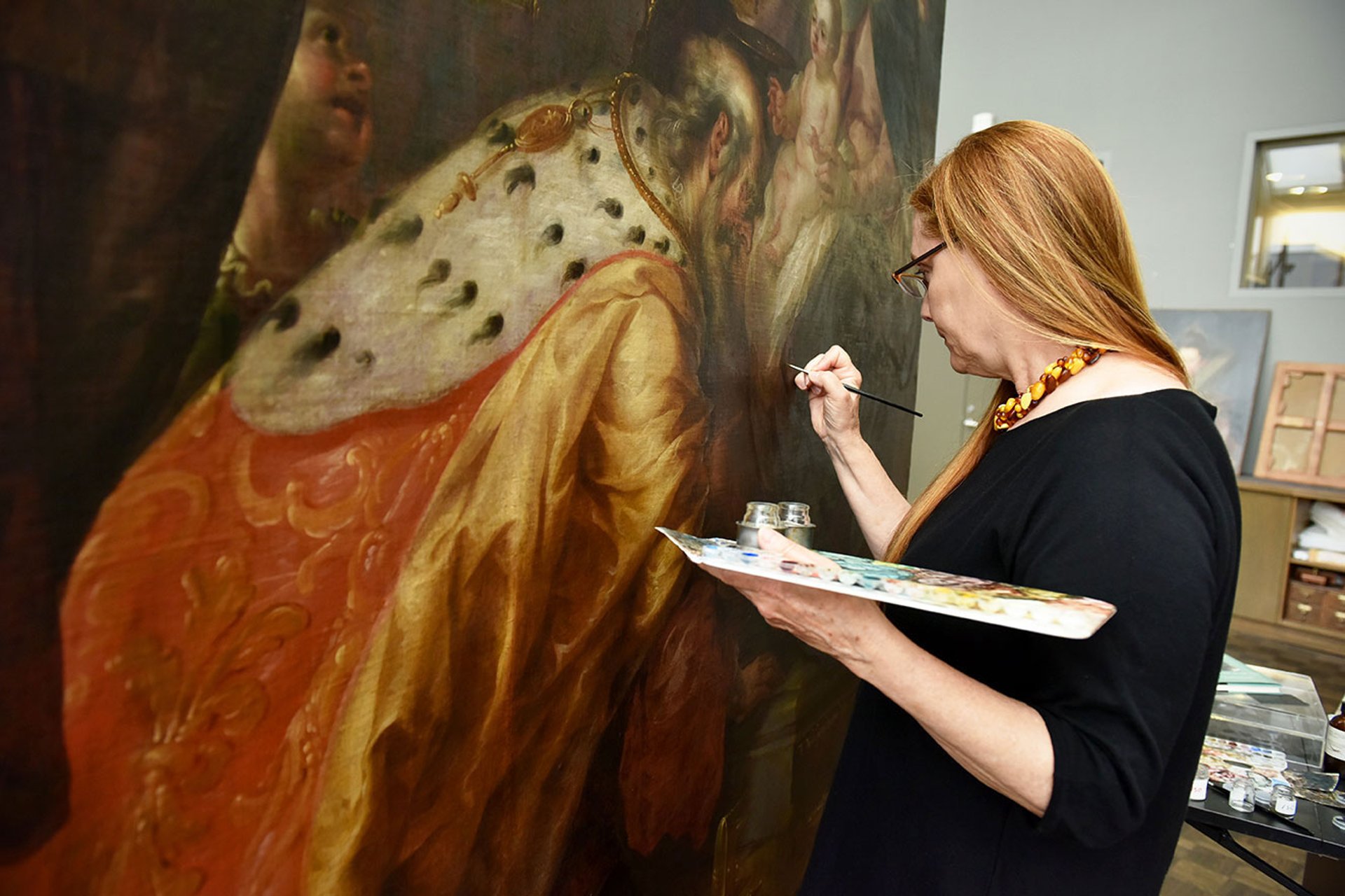 Villalpando’s use of a quality canvas, his expertise in stitching two canvases together to create a larger picture and his skilful ground preparation all contributed to the painting’s overall health, Mahon says, along with the fact that it does not appear to have previously undergone a major intervention aside from two earlier cleanings some time during its 334-year history. Mahon removed the organic glue, which had degraded, from the 19th-century lining. Although it is normal to reline a painting once you have removed the lining, Mahon says it almost did not need to be relined so she opted for a strip lining.