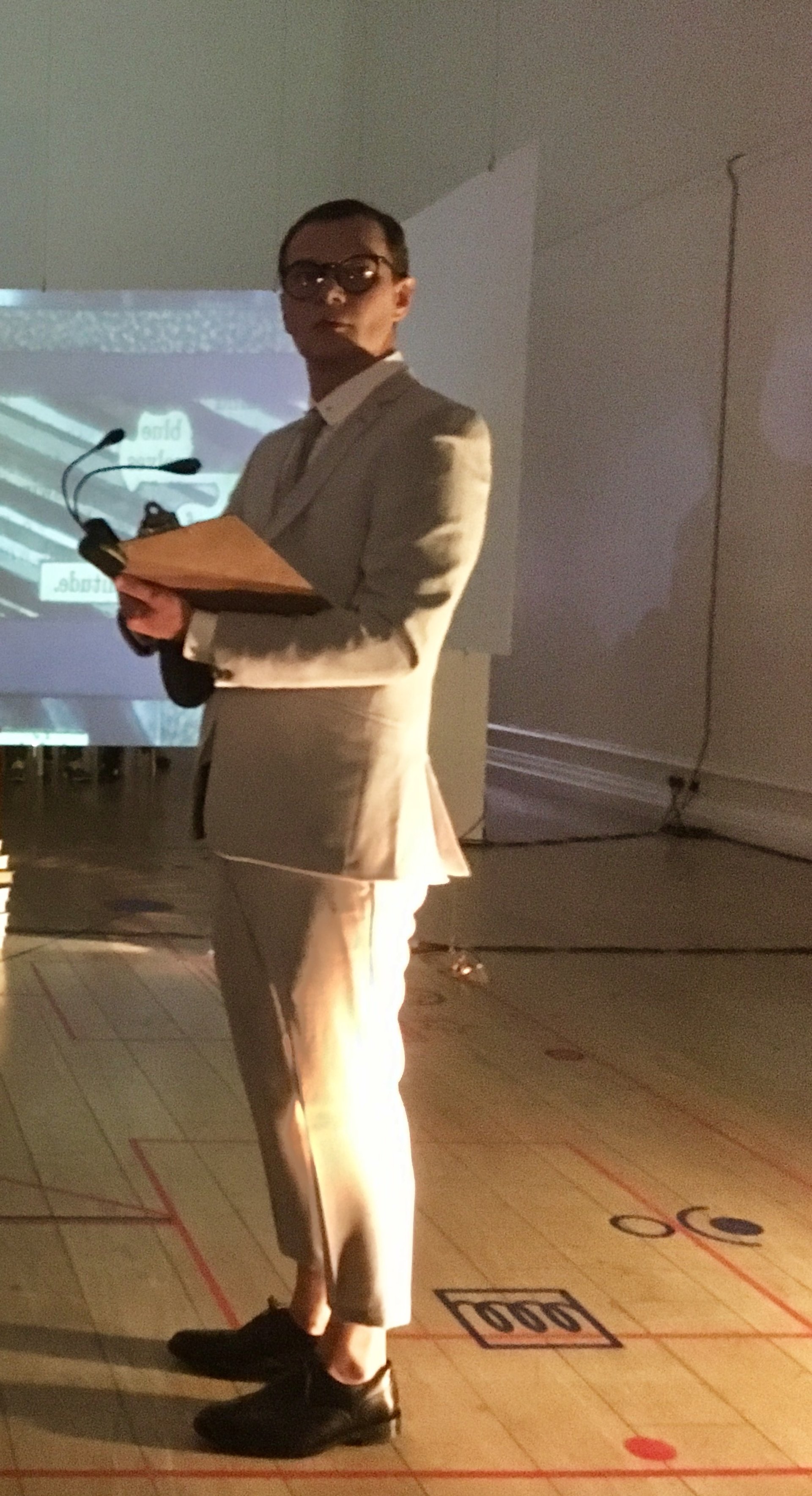 Along with the operatic tropes of the romantic hero (O’Mahony’s character Grenville) and Irma, the object of his often frustrated desire (exquisitely sung by soprano-composer Josephine Stephenson), the piece also offered a sharp sideways glance at the current ranks of the contemporary art world. This took the form of the chorus of three “Art Officers in Uniform”, brandishing illuminated clip boards and uniformly clad in the suits, lace-up brogues and heavy horn-rimmed glasses so beloved of curators and gallerists from Glasgow to Gwangju.