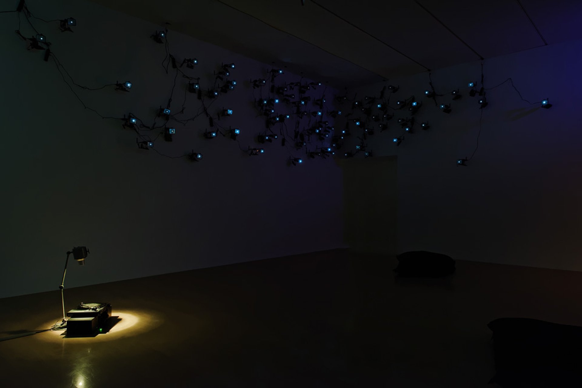 This installation by the Colombian artist Icaro Zorba uses mostly obsolete technology to create an immersive, slow moving world. Watching over from above like Medieval gargoyles are 89 tiny television screens, while a projection of a window shows a bird flutter by and a record player on the floor plays out an incredibly slow soundtrack, which resembles a recording made deep beneath the earth’s crust. Zorbar calls these outdated technologies his “little monsters” and plays with their aesthetic allure. He writes that he has “always been fascinated with discovering the inside of the machine” and pays attention to what its “apparatus is offering”. “Sometime the machine screams, sometimes it whispers”, he adds.
