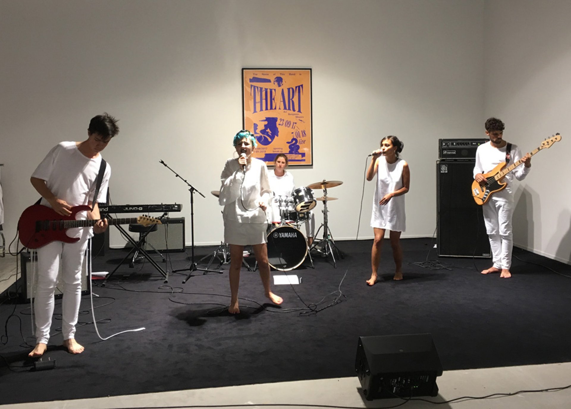 Can a pop band make art? Can a band be art? Ari Benjamin Meyers’s The Art is just that, a pop group made up of five art students thrown together for the duration of the biennial. The group— all dressed in white and belting out their improvised tunes (singing about someone who has “the blues”)—is surrounded by the typical band ephemera, such as posters and t-shirts with their “tour dates”, all of which are at the Biennale de Lyon. The Art is due to play most weekends throughout the event before announcing their break-up on the final day of the biennial.