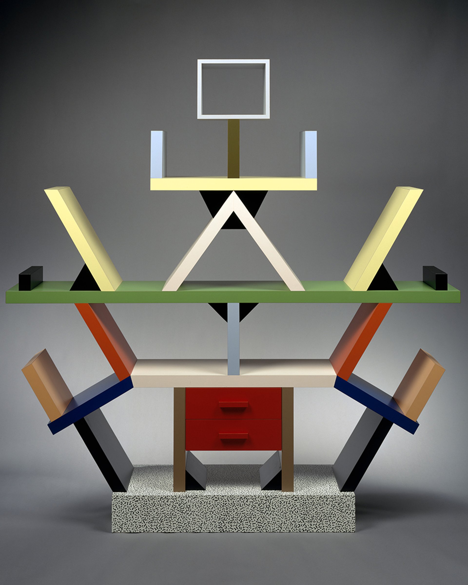 By the late 1970s, following a moody interval and after executing a series of modest, arte povera–inflected earthworks (left out of the Met survey), Sottsass allowed bestial and anthropomorphic semblances to take over. Exemplars of this tendency are thoughtfully staged in the final gallery. The majority of these mobili date from the Memphis period; the stick figure–esque Carlton room divider (1981) is the standout and, along with the Tartar console table (1985), remains the best distillation of Memphis. These are the least egregious designs to have arisen from a design school that assaulted the senses, trafficked in vulgarities and generally dispensed with good taste. Provocations you could sit on, ostensibly.