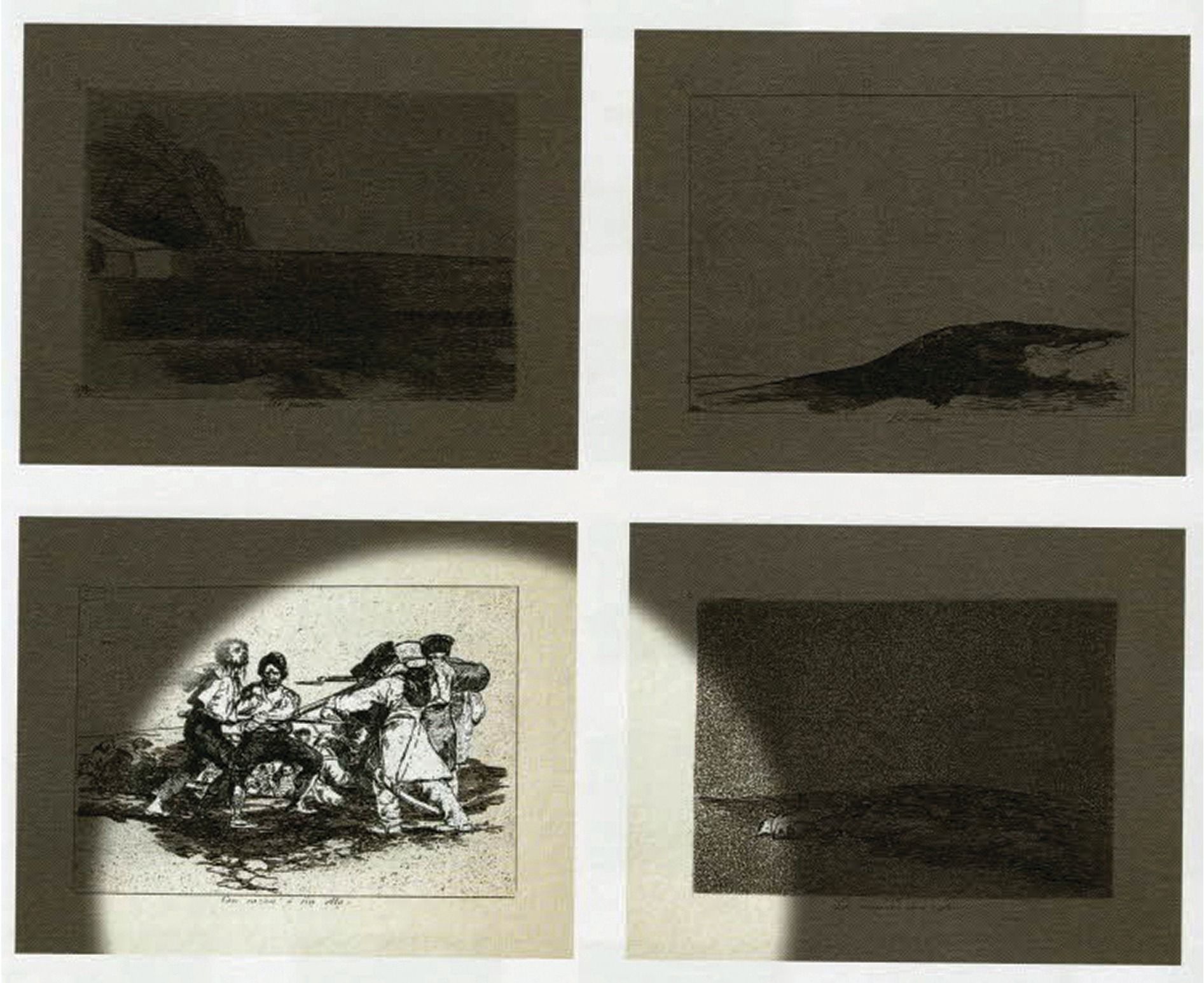 The brothers have also reworked three full sets of Goya’s series The Disasters of War (1808-14). Each set includes 80 prints, with 240 works transformed in total. The pair have superimposed images of artists such as Jackson Pollock, clowns’ heads and other ghoulish features on to the etchings, which have been reworked in various media (The Disasters of Everyday Life, monochrome collage set; The Disasters of Yoga, glitter set; and The Disasters of War on Terror, watercolour set).