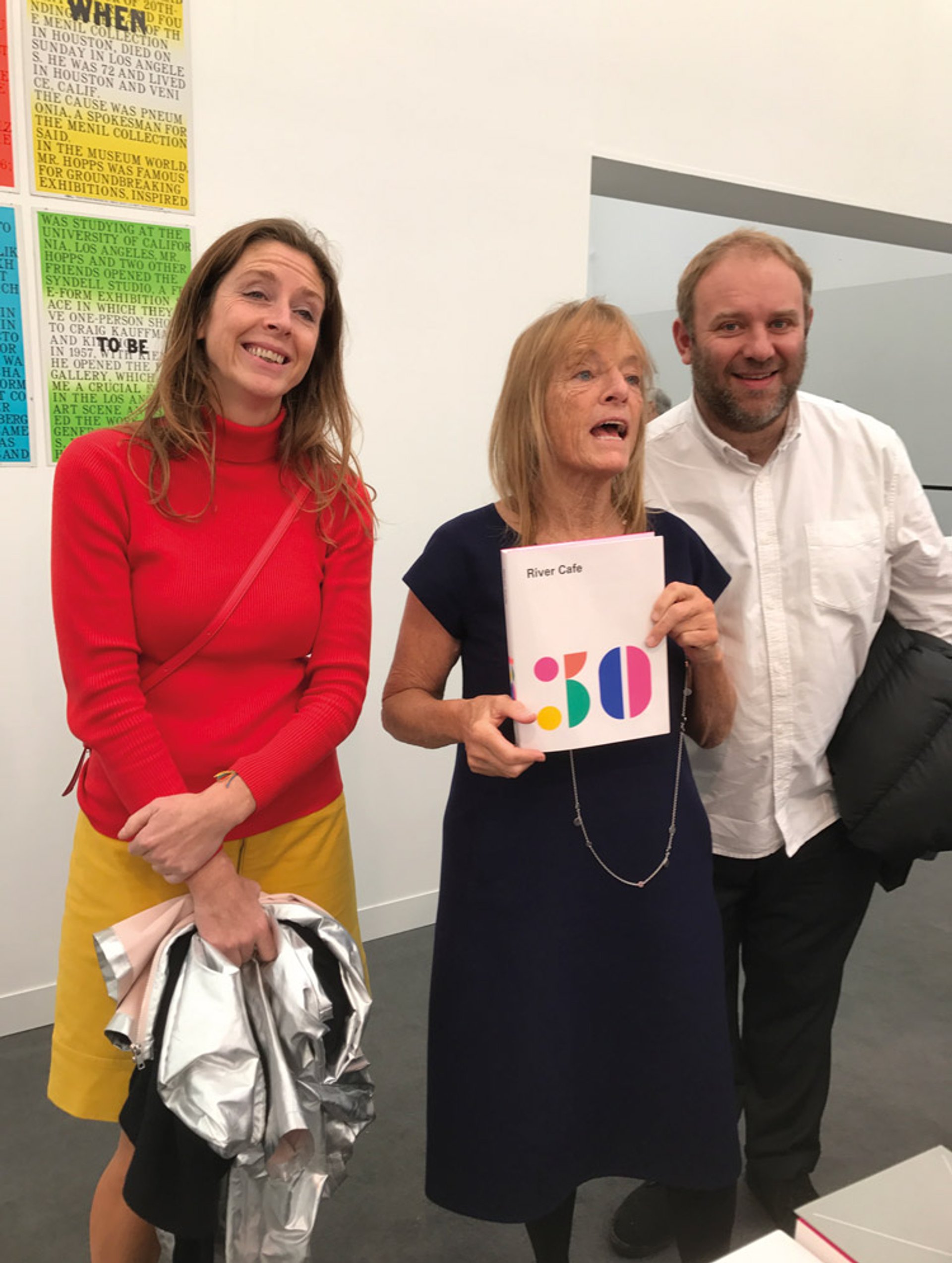 The co-founder of the Michelin-starred River Café, Ruth Rogers, popped into Frieze London yesterday to promote a lavish new book of recipes, River Café 30. Rogers paid tribute to the top-notch artists who have customised menus at the Hammersmith-based Italian restaurant over three decades. Ellsworth Kelly drew a still-life on the back of one in 1991 and a self-portrait on another. Cy Twombly wrote “I love lunch with Ruthie” on a menu after a Sunday lunch in 2004. Ed Ruscha added “YUM” in tall red letters, while Michael Craig-Martin sketched a pristine teacup. And Damien Hirst, YBA and creator of the Pharmacy restaurants? He held off the pills and adorned his menu with spots and a spin painting.