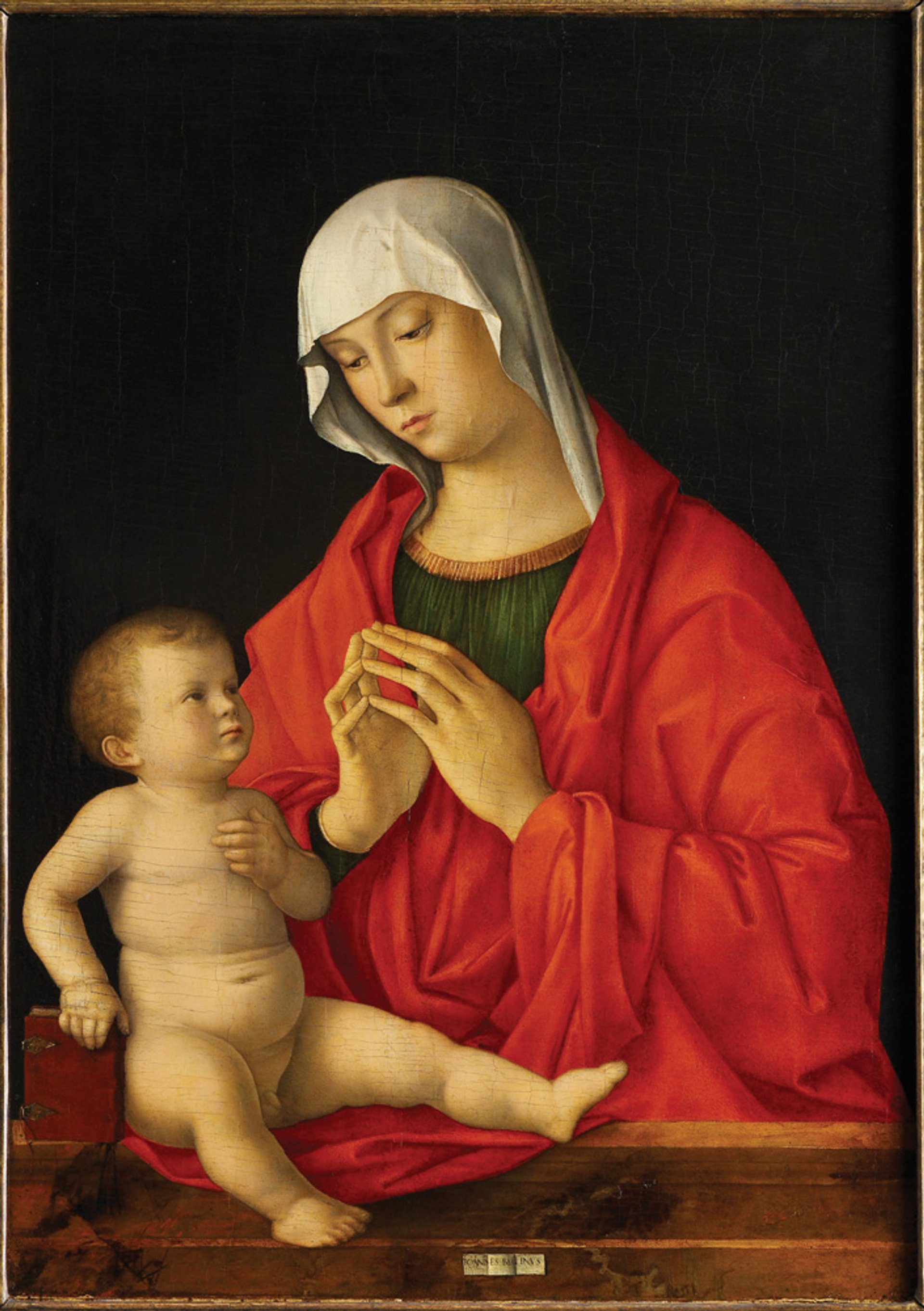 This smallish painting was made to hang in a private house to focus the minds of people saying their daily prayers. The Virgin was believed to have privileged access, as it were, to God in heaven. She herself is praying, in her role as an intermediary between humans and the Almighty, who is present here in the form of the baby Jesus, whose hand rests on a book, presumably the four Gospels, which tell the story of his life. Bought for Louvre Abu Dhabi