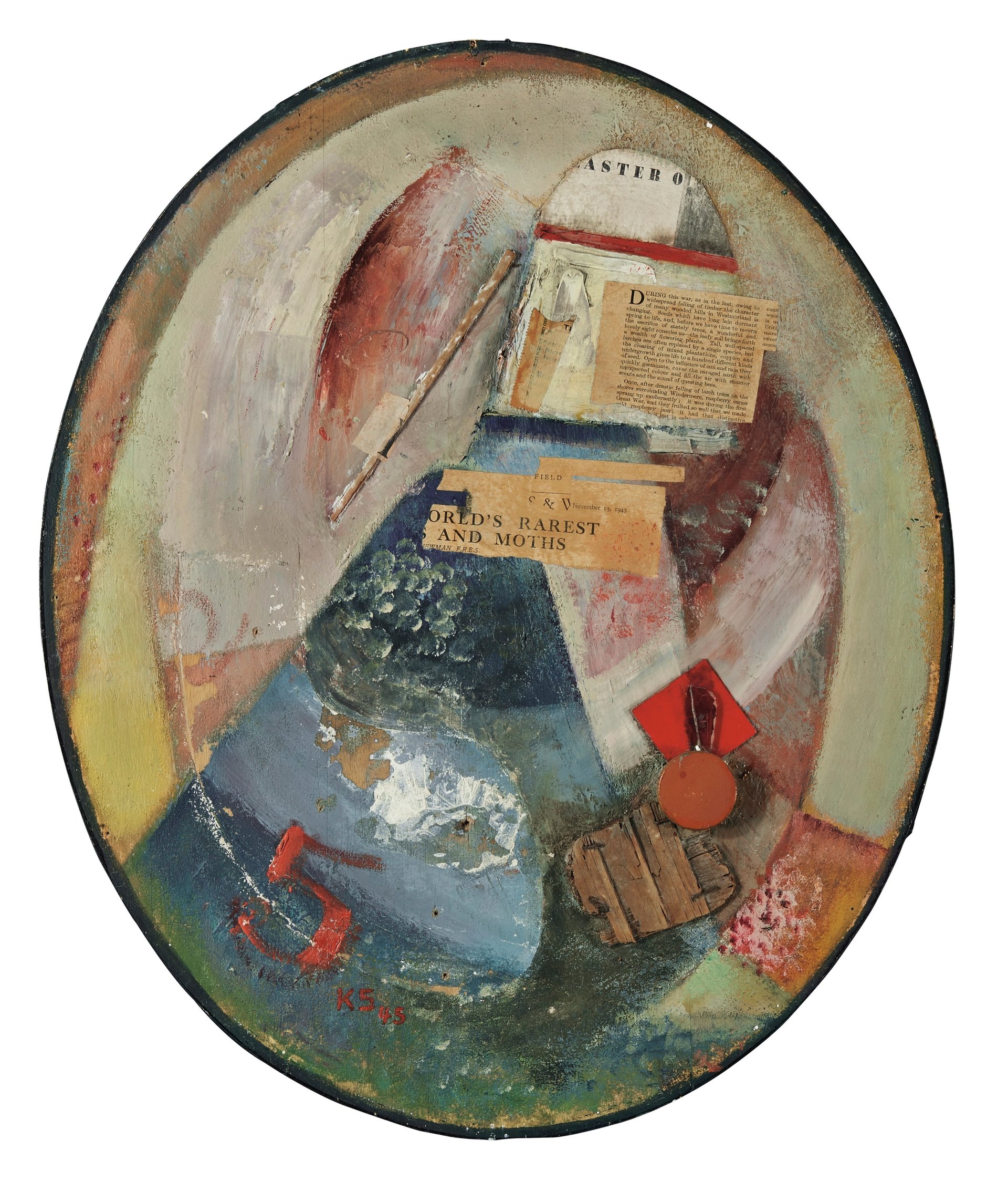 This work was created just three years before the German Dadaist and Constructivist died in exile in London. Measuring around 23 inches tall and 19 inches wide, it is one of the largest works Schwitters produced in the last period of his career. The work combines oil on panel with wood, plastic, glass, metal, fabric and newsprint assemblage, an example of the artist’s Merz (an abbreviation of “kommerz”) works, in which the artist elevated the status of commonplace objects and text clipped from magazines or newspapers, creating what he called “visual poems” with a rigorous discipline. In these works, the artist paradoxically insisted that the composition’s content (including, in this one, a snippet that reads “Orld’s Rarest and Moths”) refers “to nothing outside of” itself—and indeed cannot do so “without loosening its ties to art”. Schwitters is quoted as saying having said: “material matters as little as I do, [but] what matters is forming it”.