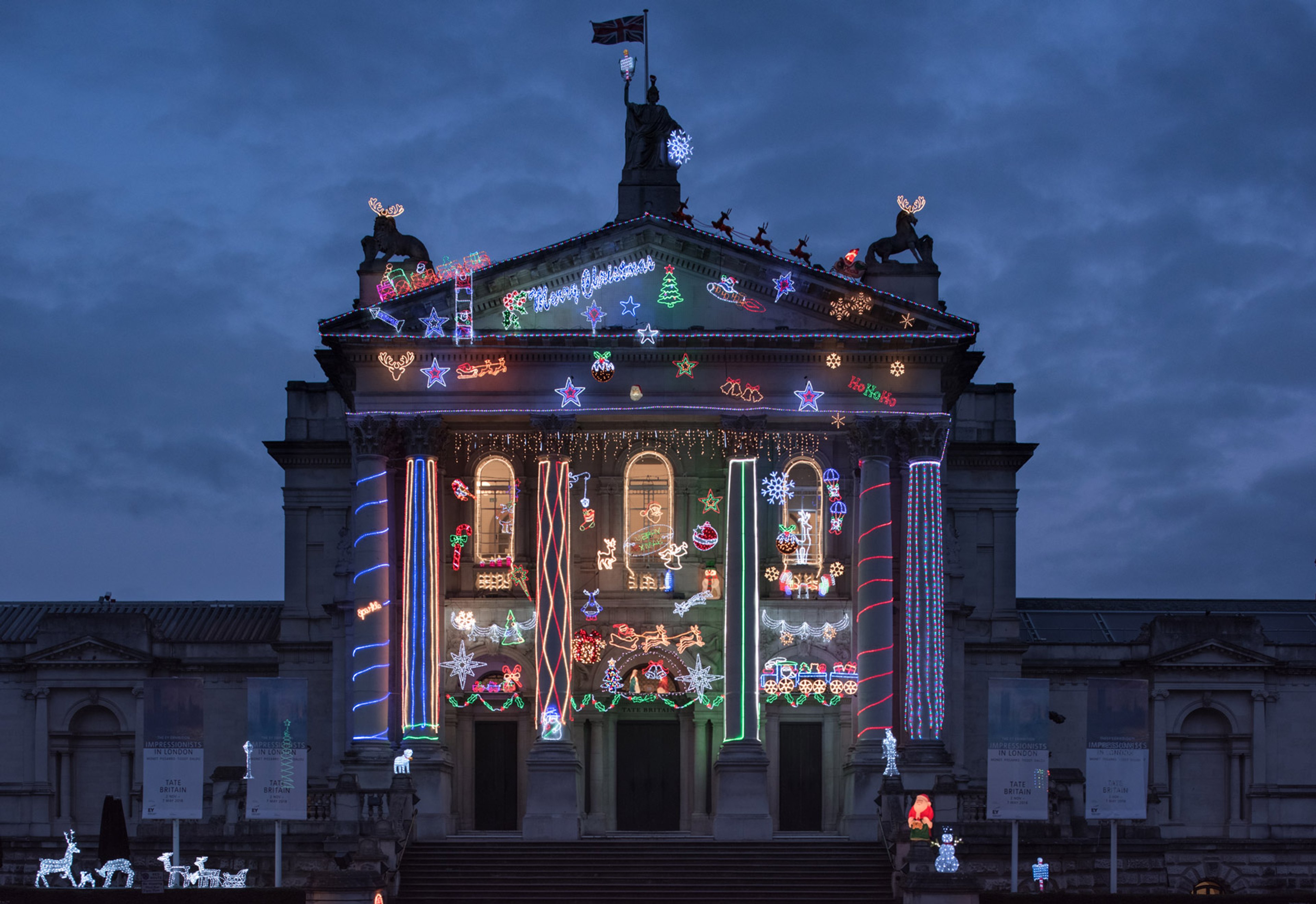 With his decorations for the front of The Tate Britain, the Canadian artist Alan Kane intends to highlight the divide in art. The decorations, called Home For Christmas, show art as an academic convention and a more common creative act in his installation, showing until 6 January 2018. With candy canes, Christmas pudding, antlers for the lion and horse monuments sitting on the roof, snowflakes and illuminating pillars, Kane shows that Christmas decorations for your house can also work on one of the capital’s leading art galleries. Tate, Joe Humphrys
