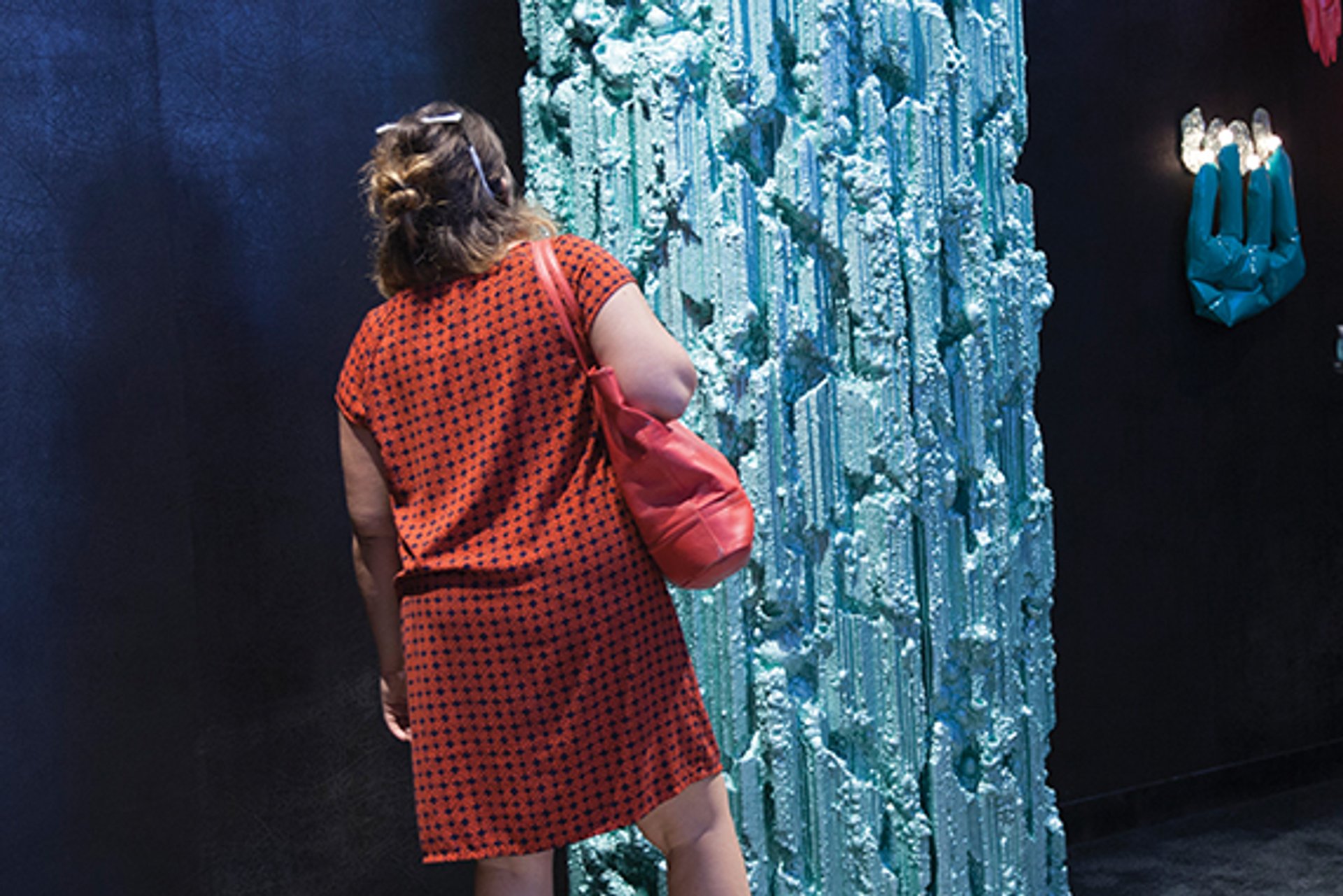 The gallerist Marc Benda flagged Chris Schanck as one to watch soon after he graduated from art school in 2011. The Texas-born, Detroit-based designer enlists local artists and students to assist him in translating his drawings into pieces of furniture that refer to everything from sci-fi films to ancient iconography. This armoire, which looks as though it is made of crystals, is actually formed from steel, wood, resin, polystyrene and suede. It sold at the fair’s VIP opening.