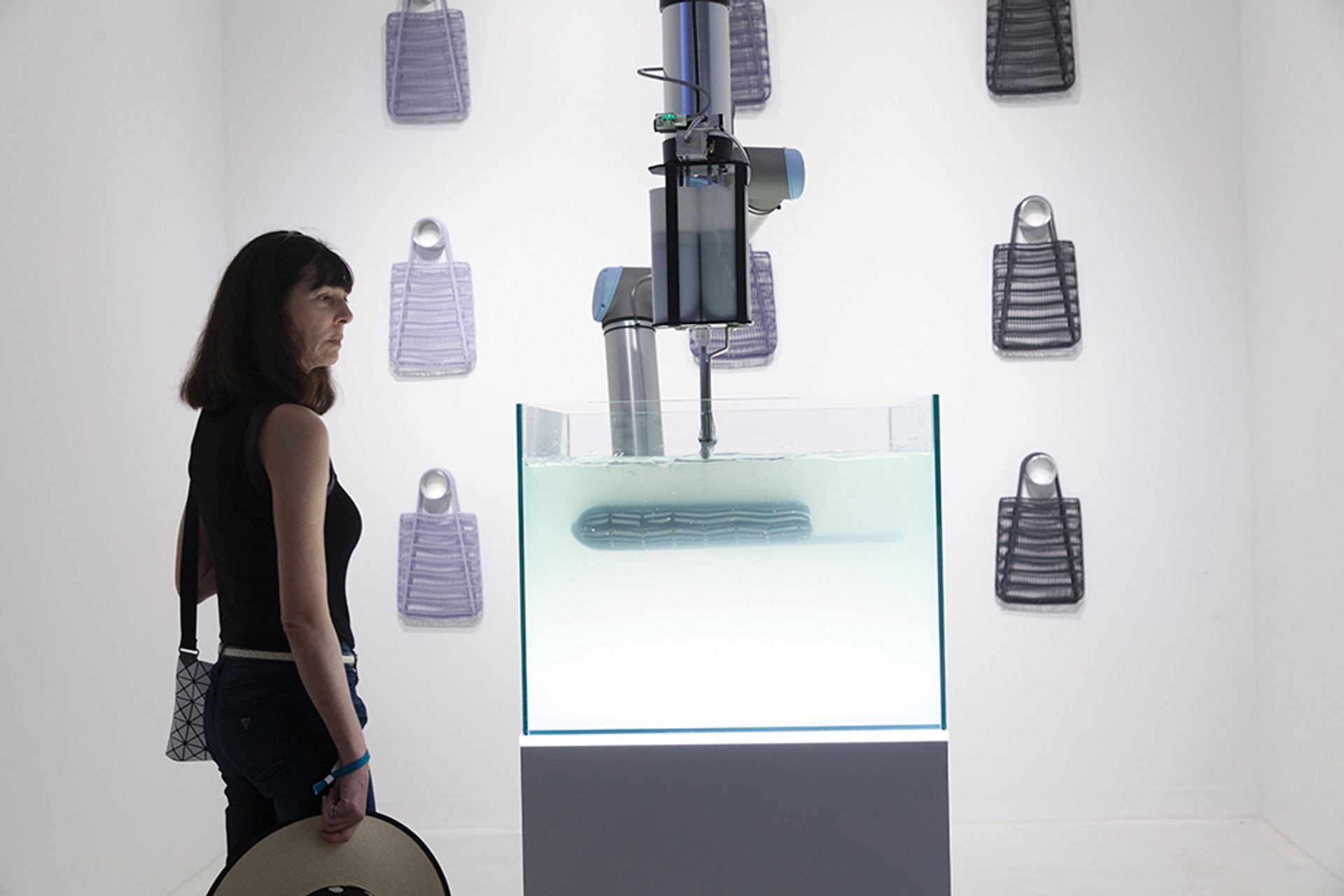 Beach bags may be a dime a dozen in Miami, but how many people can say theirs was made in a tank of gel by a robot? The designer Christophe Guberan, the MIT Self-Assembly Lab and Patrick Parrish Gallery have teamed up to demonstrate the merits of Rapid Liquid Printing, the latest innovation in 3D printing, which makes it possible to create objects quickly using any industrial liquid material, such as rubber, plastic or foam. The bags are being produced on-site at the fair, and a lamp made using this technology is on Patrick Parrish Gallery’s stand.
