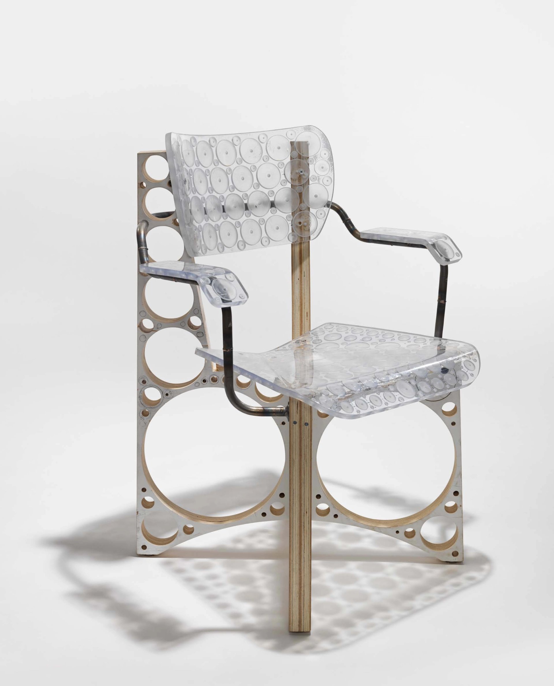This is a prototype, made in Tom Sach’s studio, of a chair that is being rolled out into production and is available exclusively through Salon 94 Design. Like the production version, it is constructed from steel, milled and thermoformed polycarbonate, titanium and rubber. The plywood base has “lightening holes”, a technique used in the aerospace industry as a weight saving measure that retains strength. The prototype is signed by the US artist and the production versions have a signature plate. Sachs’s chairs recently appeared in a video by the pop artist Frank Ocean, who was spotted at the fair’s opening.