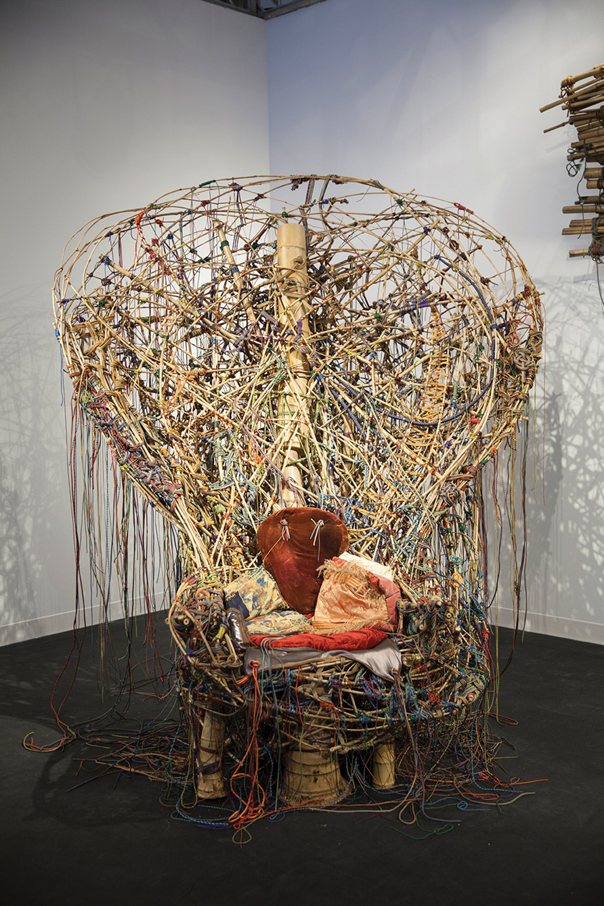 Mike Starn says that the brothers’ first official line of furniture developed organically, when it “started growing like fruit” on their monumental bamboo towers, which often include living room-like spaces. This high-backed chair is made from hundreds of bamboo shoots held in place by colourful rock-climbing ropes, and comes with cushions inspired by 19th-century Moroccan saddles.