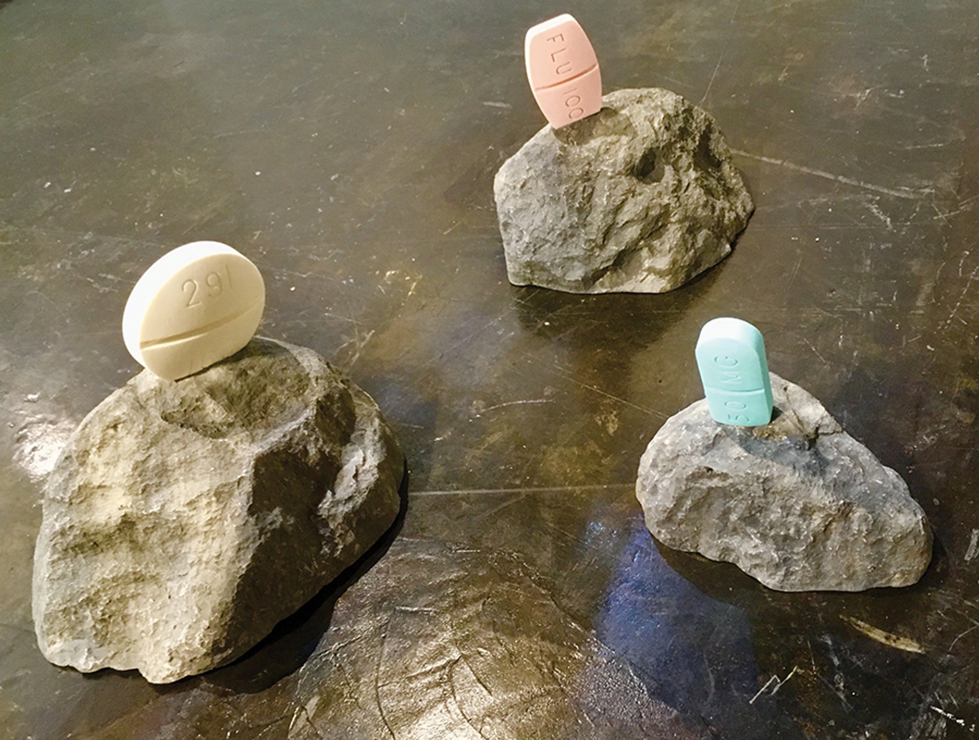 Three sculptures of giant pills, made from soap and set in fibreglass rocks, are attracting much comment on Simon Preston Gallery’s stand at Nada Miami—perhaps because people could relate to them. The works, by the Los Angeles-based artist Marco Rios, are giant replicas of medications used to treat depression, obsessive-compulsive disorder and acute migraines, which sounds like an ideal chemical cocktail for Miami Art Week. “We’ve already got all of those in our bathroom,” one collector admitted.