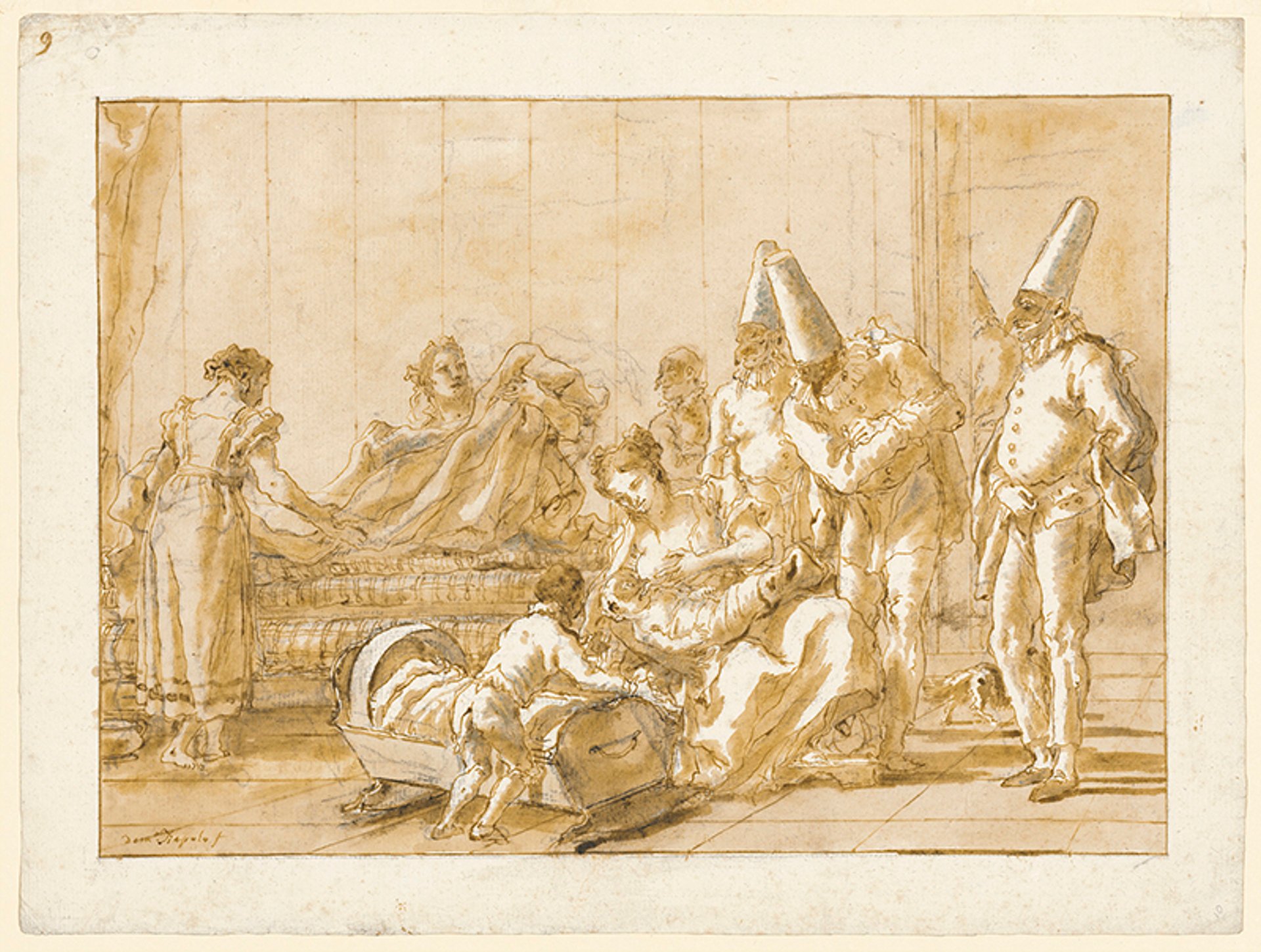 This drawing, done in black chalk, pen and brown ink, with touches of reddish-brown wash, displays Tiepolo’s comic flair. It belongs to a series he made of Punchinello, a central character of the commedia dell’arte, portraying the fiendish protagonist (a forerunner of Mr. Punch) in various stages of his life. The series, which originally comprised 104 drawings, was titled “An Amusement for Young People”; the drawings are now largely dispersed among major museum collections. While few scenes are easily decipherable to modern viewers, this one, numbered nine at the upper left margin, shows the infant Punchinello being nursed while masked jester-like figures stand in the background. The work was last shown in 1996 at the Indiana University Art Museum, Bloomington, and sold to the present owner the same year in a Christie’s London sale for £133,500m (est £80,000-£120,000). The highest auction price for a work from this series was set at Sotheby’s New York in 2012 with a more complex composition that achieved $722,500 (est $300,000-$400,000).
