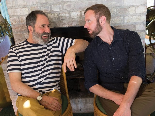 Mark Allen and Patrick Ballard (white haired guy) “casting spells” at closing party of Machine Project in L.A. Machine Project; Ian Byers-Gamber