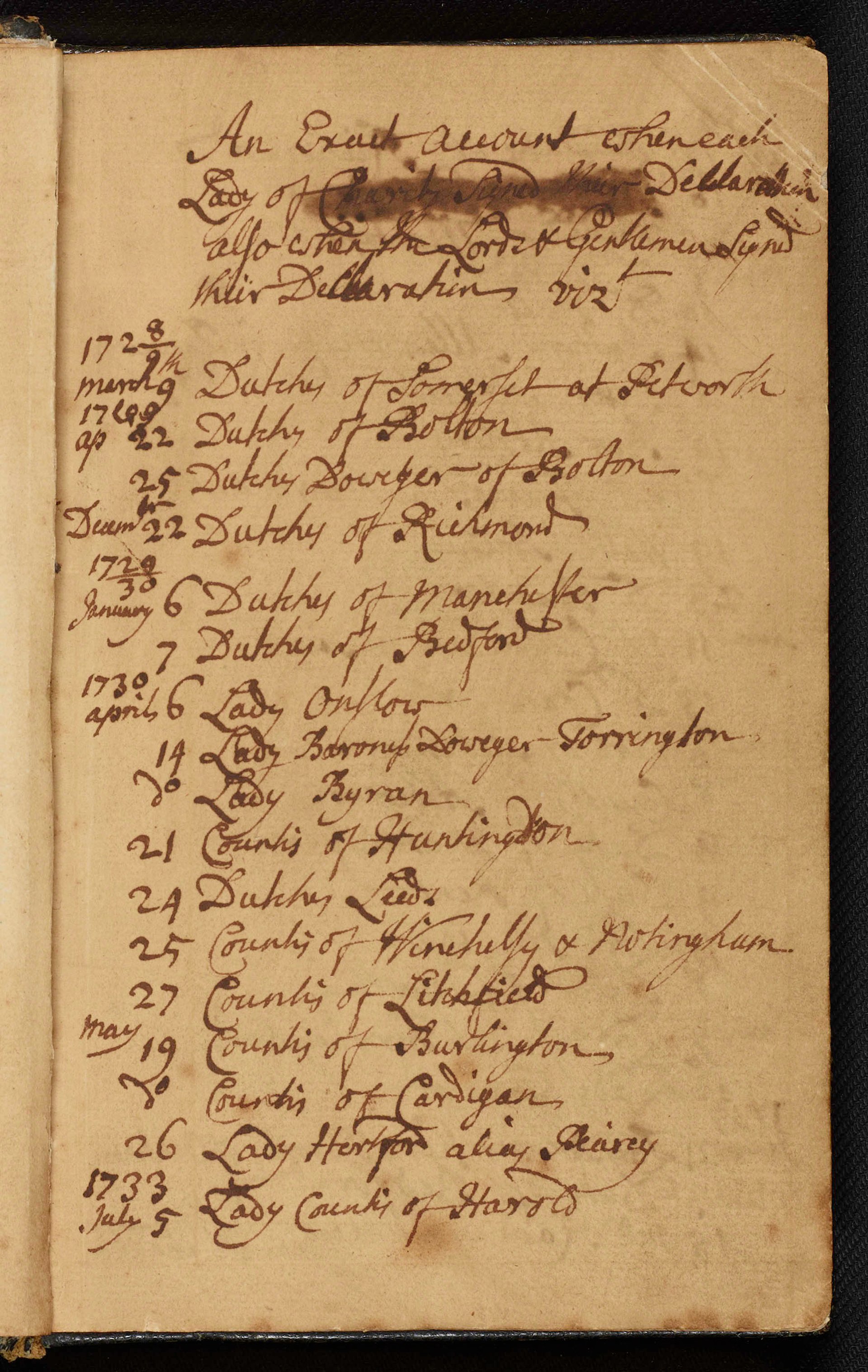 Thomas Coram's pocketbook with the names of the 21 ladies of quality and distinction Coram