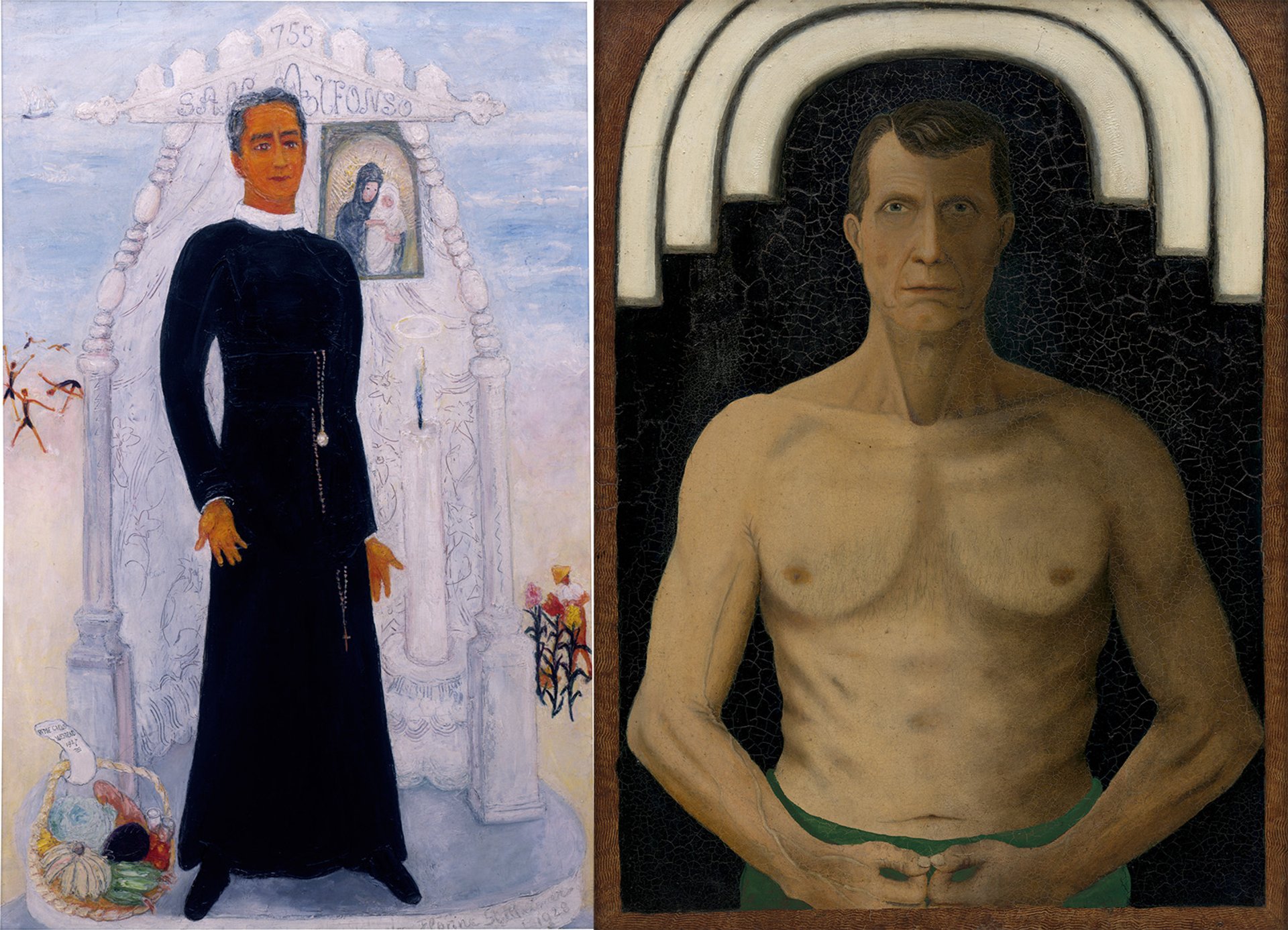 In one gallery, there is a picture of a priest in a simple black garb against a hazy, mystical and flattened background. It is painted in a sincere and simple folk style by Florine Stettheimer (1871-1944), the gifted artist and wealthy Manhattan saloniste. Nearby, there is a similarly “naive” portrait by the self-taught painter and one-time Pittsburgh manual laborer John Kane (1860-1934), where he depicts himself against a comparably shallow backdrop (this time black instead of Stettheimer’s white) with his head surrounded by a trio of haloes. These paintings look better together than they do separately, in part because they indicate the complexity and reversibility of history. Whereas Kane became celebrated in his lifetime and showed his work at the Museum of Modern Art (MoMA) and the Whitney, Stettheimer held much of her painting from public view while still hosting soirees that drew Modernists such as Alfred Stieglitz and Marcel Duchamp.