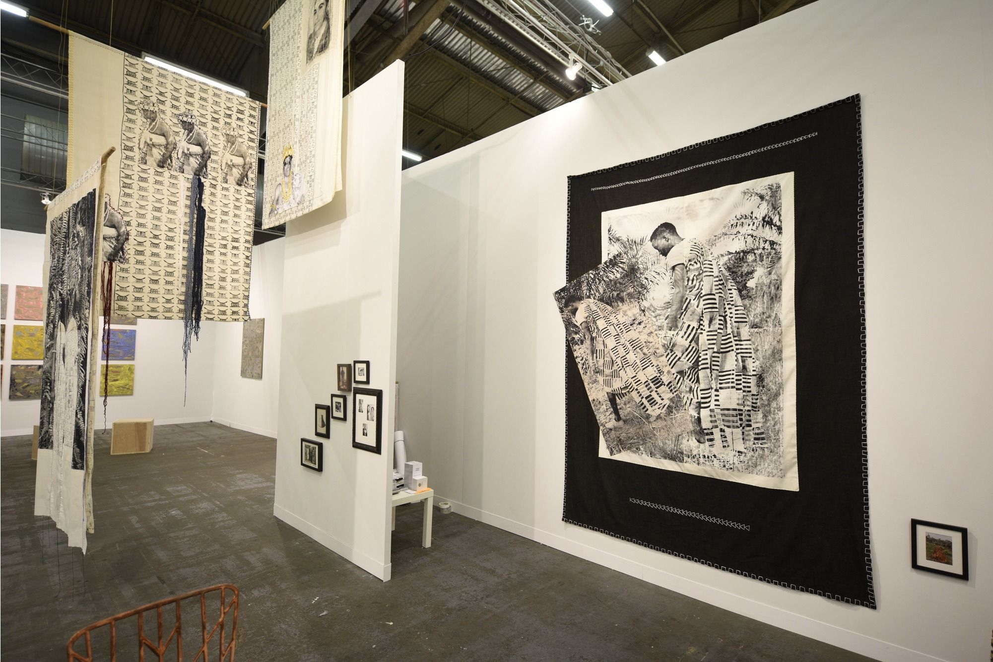 "We were surprised as it's a quite a simple hang," says blank projects' owner Jonathan Garnham of the stand's three small-to-medium-sized paintings by Samson and one hanging textile wall piece by Adams, who recently won South Africa's Standard Bank Young Artist Award. "There is kind of a conversation happening between the two artists," Garnham adds. "Igshaan saw Cinga's paintings and I think was responding to them to a degree". Both artists, in unconventional and quiet ways, celebrate the new possibilities afforded black men of their post-apartheid generation, the so-called born-frees.