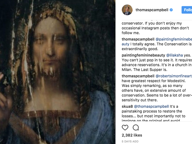 Perhaps the most strident debate around the sale of the $450m Leonardo at Christie’s last year concerned the painting’s condition. Christie’s released a pre-conservation image of Salvator Mundi that revealed cracks to the walnut panel and significant losses on its surface. Thomas Campbell, the former director of New York’s Metropolitan Museum of Art, posted the image on Instagram with the caption “450 million dollars?! Hope the buyer understands conservation issues…”, prompting a flood of comments. Among them was that of The Art Newspaper contributor, Bendor Grosvenor, who wrote on Twitter that if Campbell had followed the work of the Met’s conservation department, “he would know that many Old Master paintings look like this, when stripped down”.