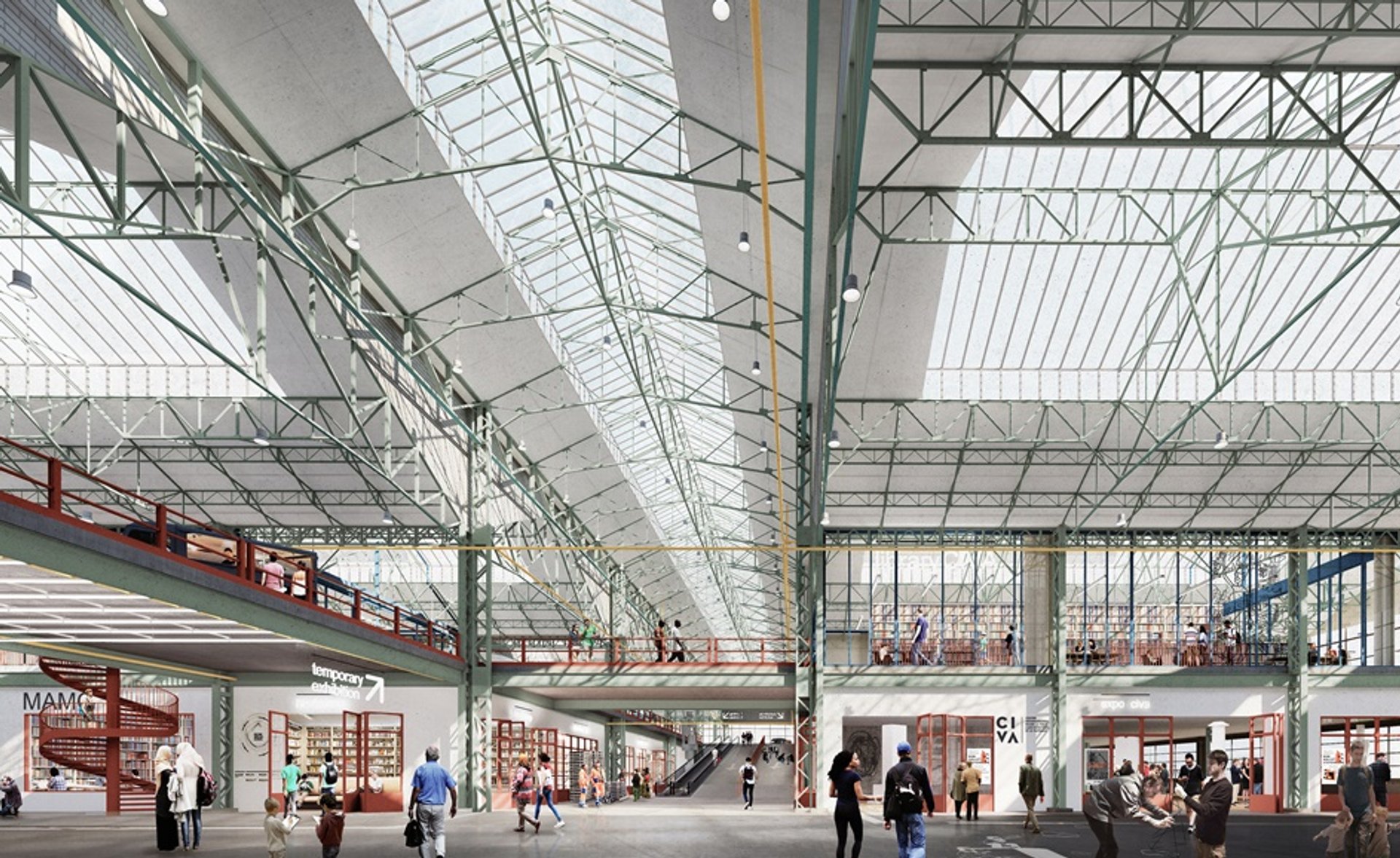 The architects say in a statement that they intend to open up the central space in the Citroën building. “Our proposal celebrates its icon, the former Citroën showroom, by opening it up and inviting the city in,” they say. “Inside, a transverse ‘street’ will cross the site measuring 35,000 sq. m, giving access to three large ‘boxes in the box’, which will be inserted in the former workshops and will accommodate the Museum of Modern and Contemporary Art, the CIVA Foundation and a 400-seat auditorium.” A production space will be available for artists and schools to work in.