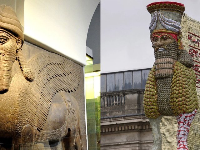 Michael Rakowitz’s sculpture, The Invisible Enemy Should Not Exist, was unveiled in Trafalgar Square this week as the latest Fourth Plinth commission (until March 2020). The work recreates an Assyrian winged bull with a human head, known as a lamassu, created in the ancient Mesopotamian city of Nineveh in 700 BCE but destroyed by Islamic State in 2015. It wears what the artist has called an “armour” of colourful date syrup cans, which Rakowitz has worked with for many years and identified as a symbol of the Iraqi people and the refugees that have fled the country in recent years—dates are to Iraq what cigars are to Cuba, he has said. “The salvage of date syrup cans in this work makes present the human, economic and ecological disasters caused by the Iraq wars and their aftermath,” he said in a speech just before the sculpture was unveiled. “The reconstruction of the lamassu set on the Fourth Plinth allows an apparition to haunt Trafalgar Square at a time when we are witnessing a massive migration of people fleeing Iraq and Syria.”