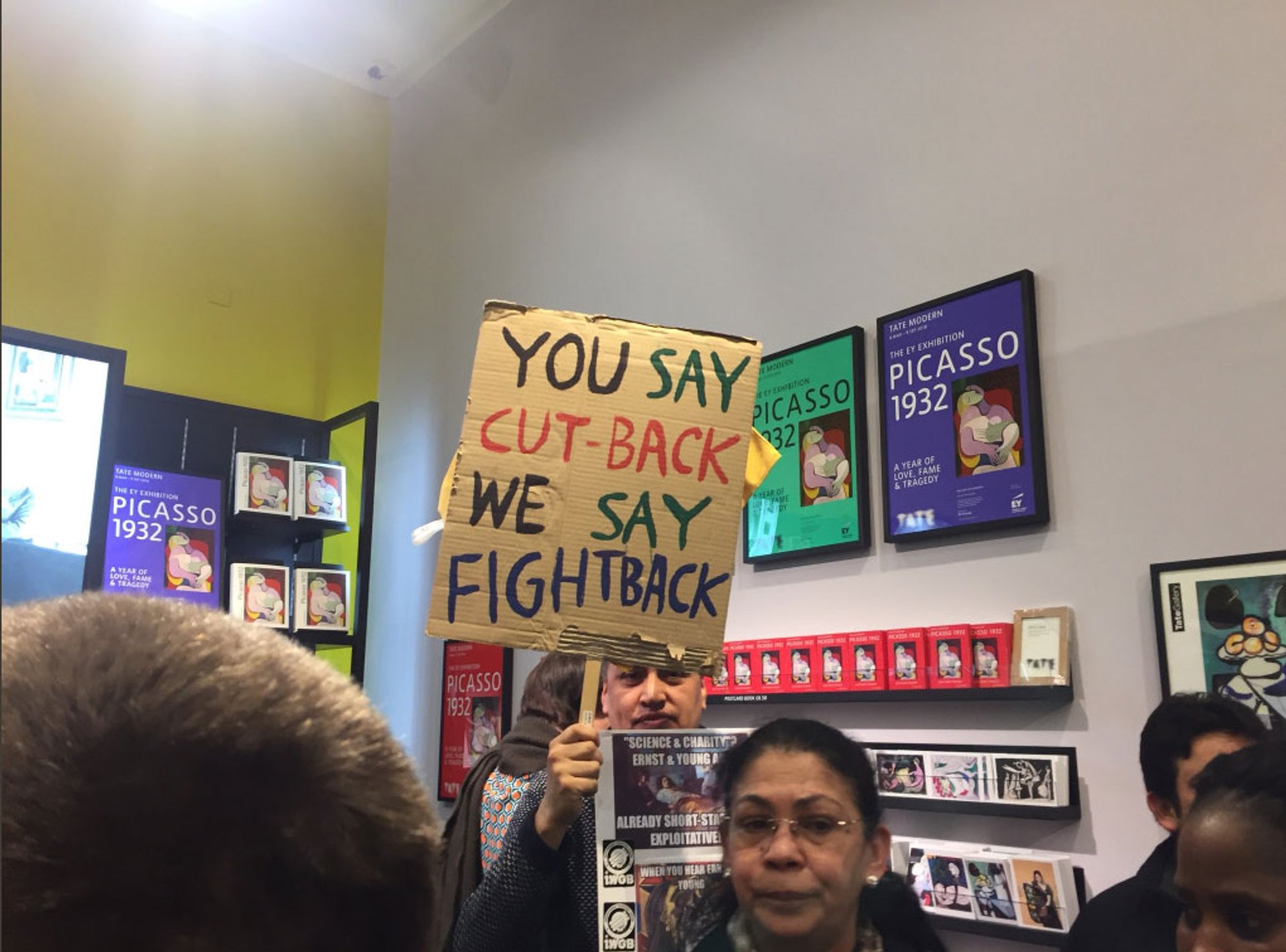 Holding signs and handing out flyers at Tate Modern, members of the Independent Workers Union of Great Britain (IWGB) were demonstrating on 14 April over the potential redundancies facing cleaners by the London-based investment firm Ernst & Young (EY), a major sponsor of the Picasso exhibition.