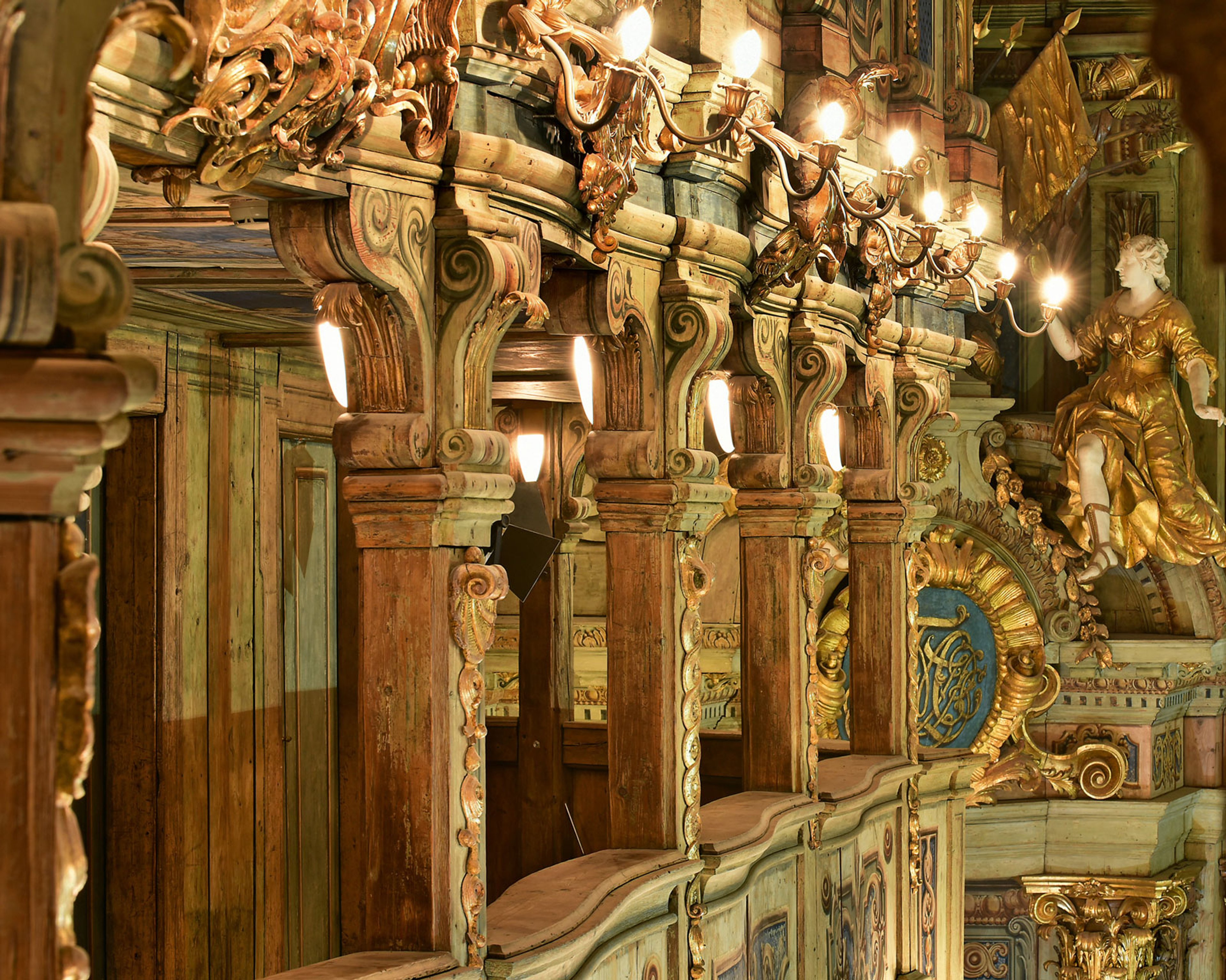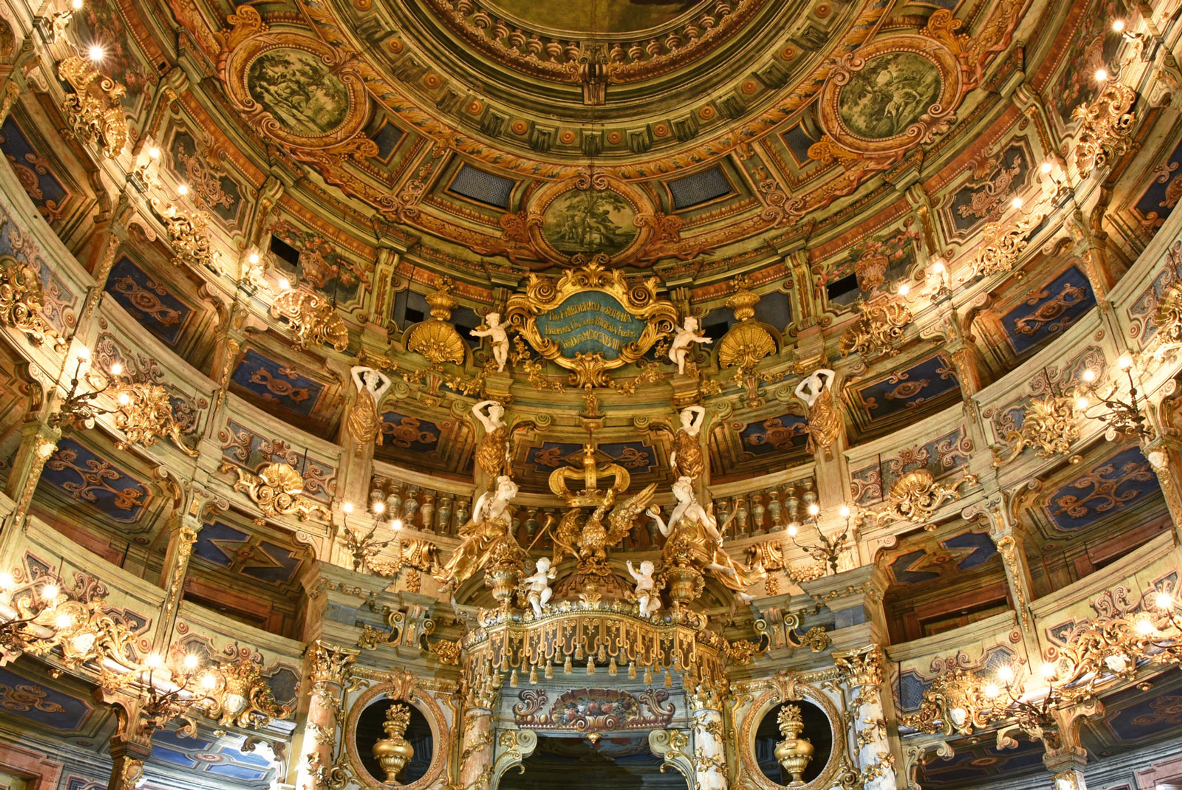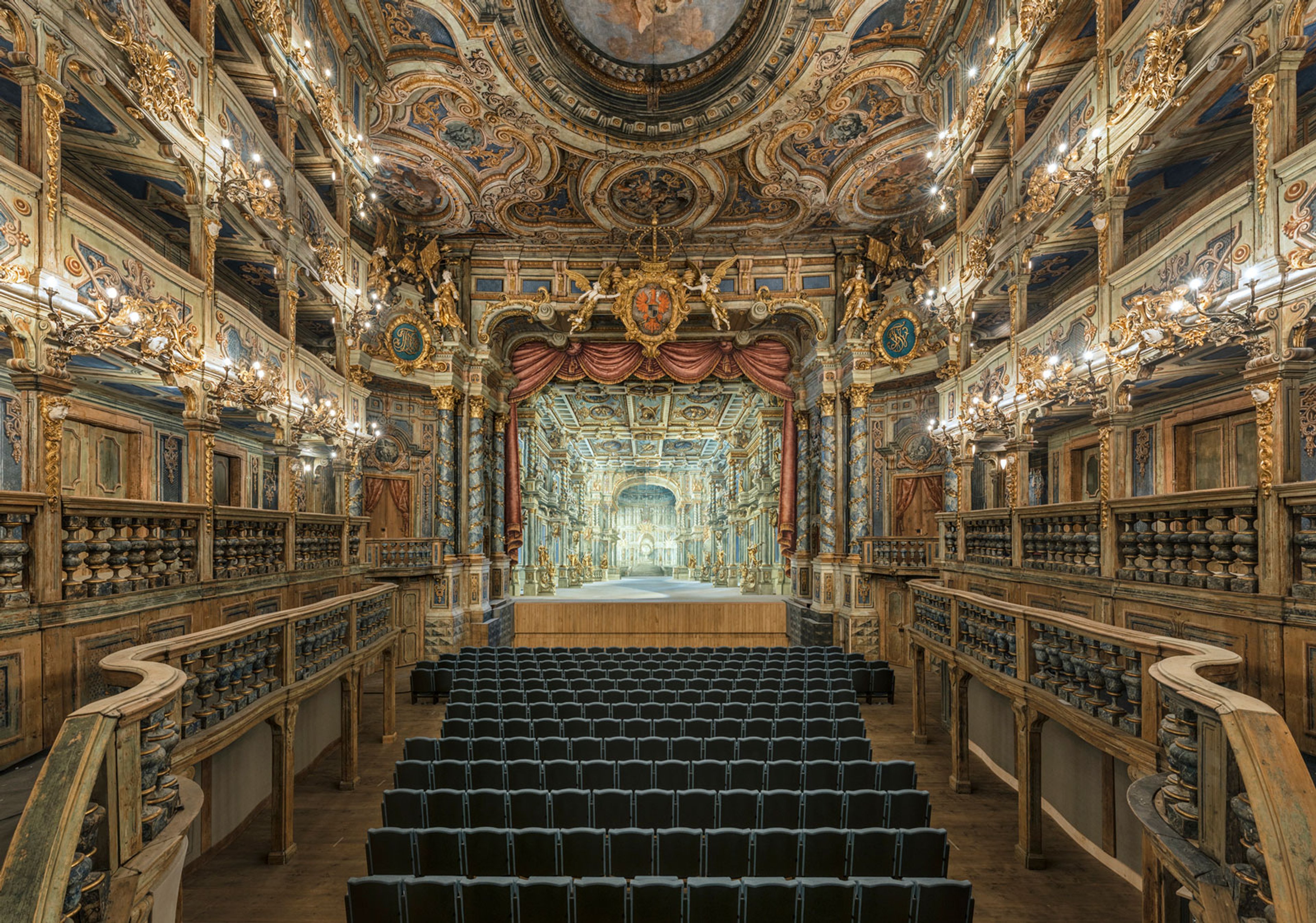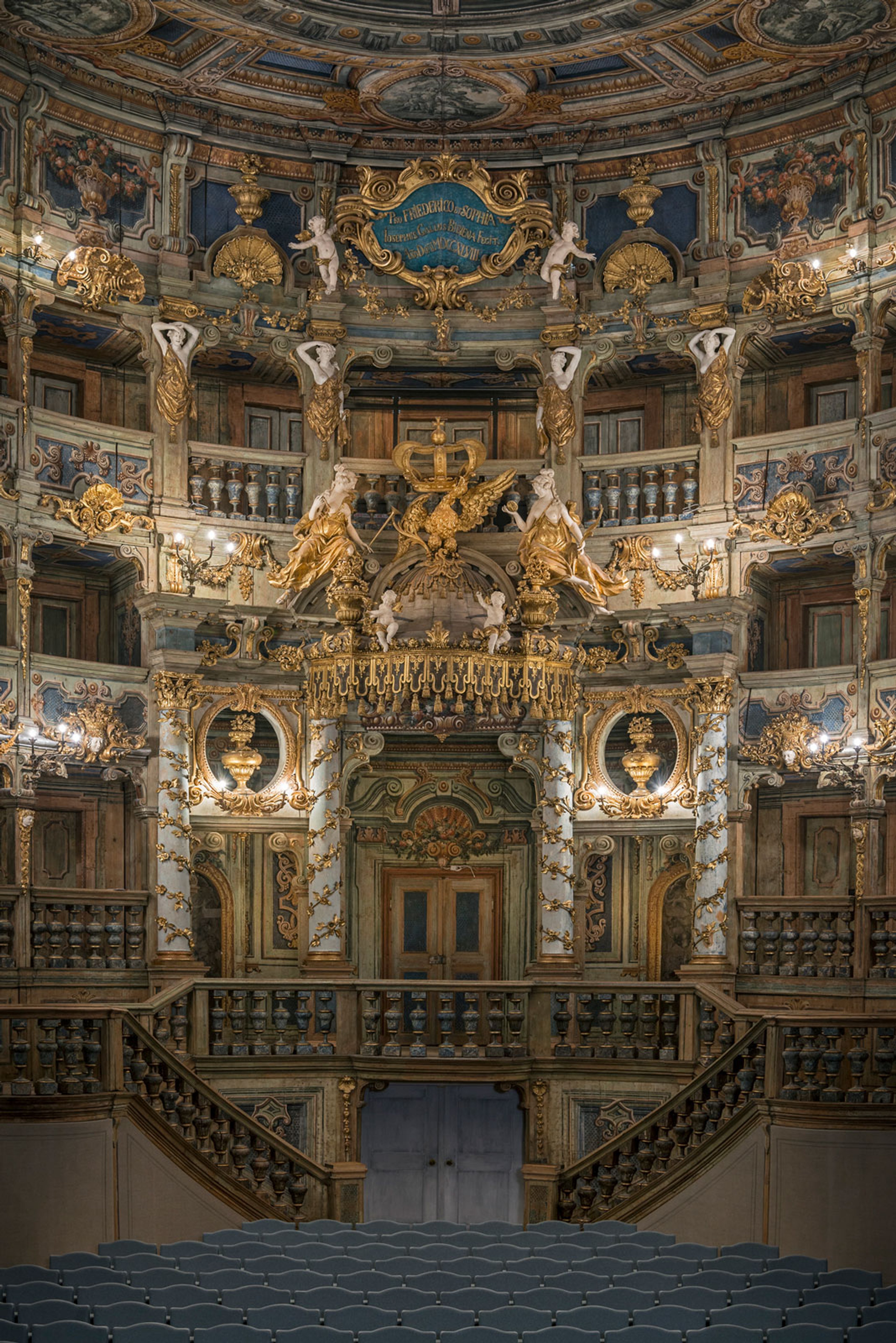The opera house was first built in 1748. One of the first operas to be performed at the venue, Artaserse by Johann Adolph Hasse, has been reprised for this grand reopening, showing on 12, 14 and 15 April. This is the view of a rank in the auditorium in front of the left trumpeter’s box. Margravial Opera House