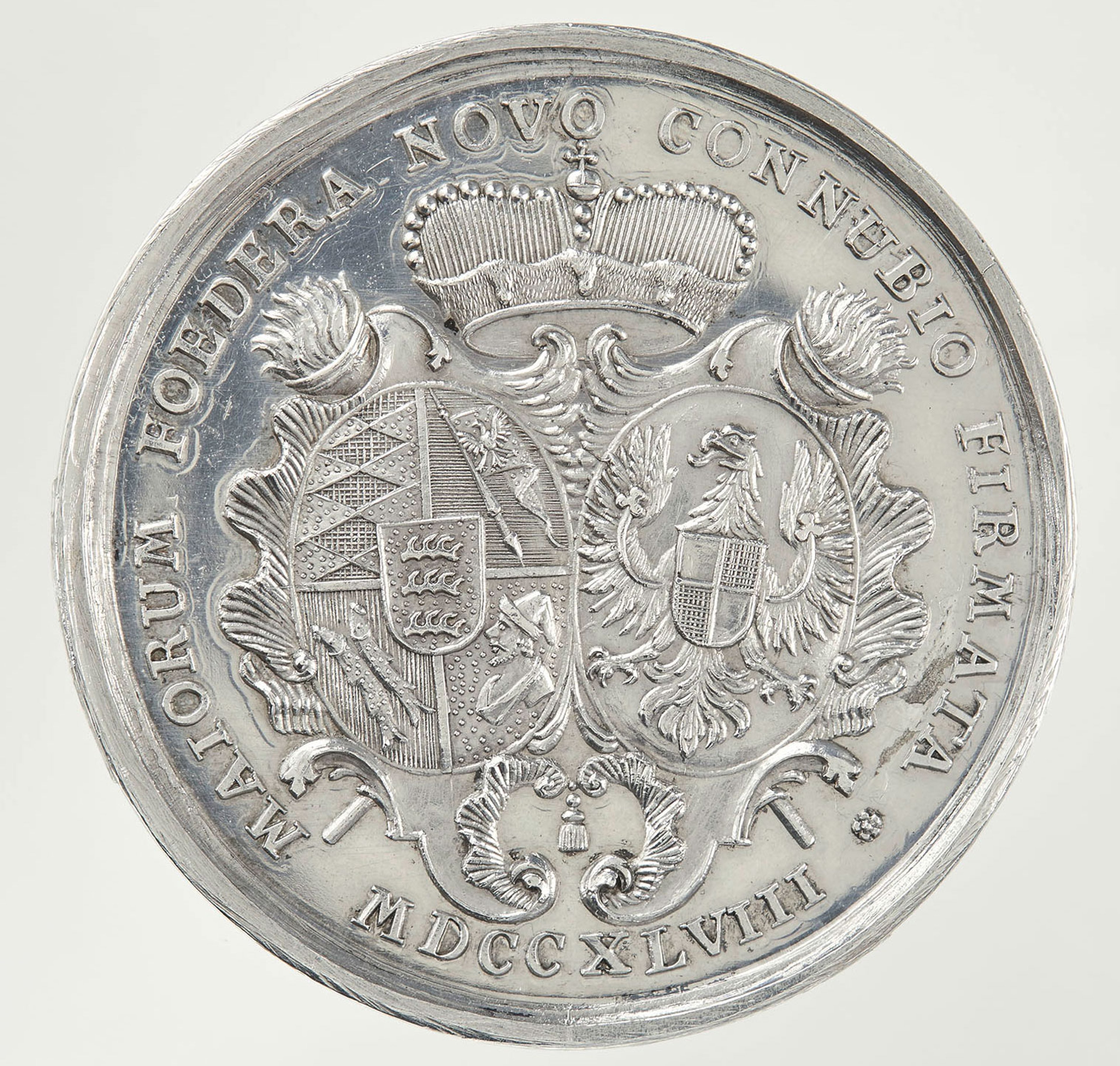 The opera house was first built for the marriage of Margravine Wilhelmine’s only daughter Princess Elisabeth Friederike Sophie to Duke Carl Eugen von Württemberg in 1748. The original opening came alongside a magnificent festival and performances of Italian operas. This depicts a commemorative silver medal for the occasion of the wedding, showing the coat of arms of the bride and groom. Margravial Opera House