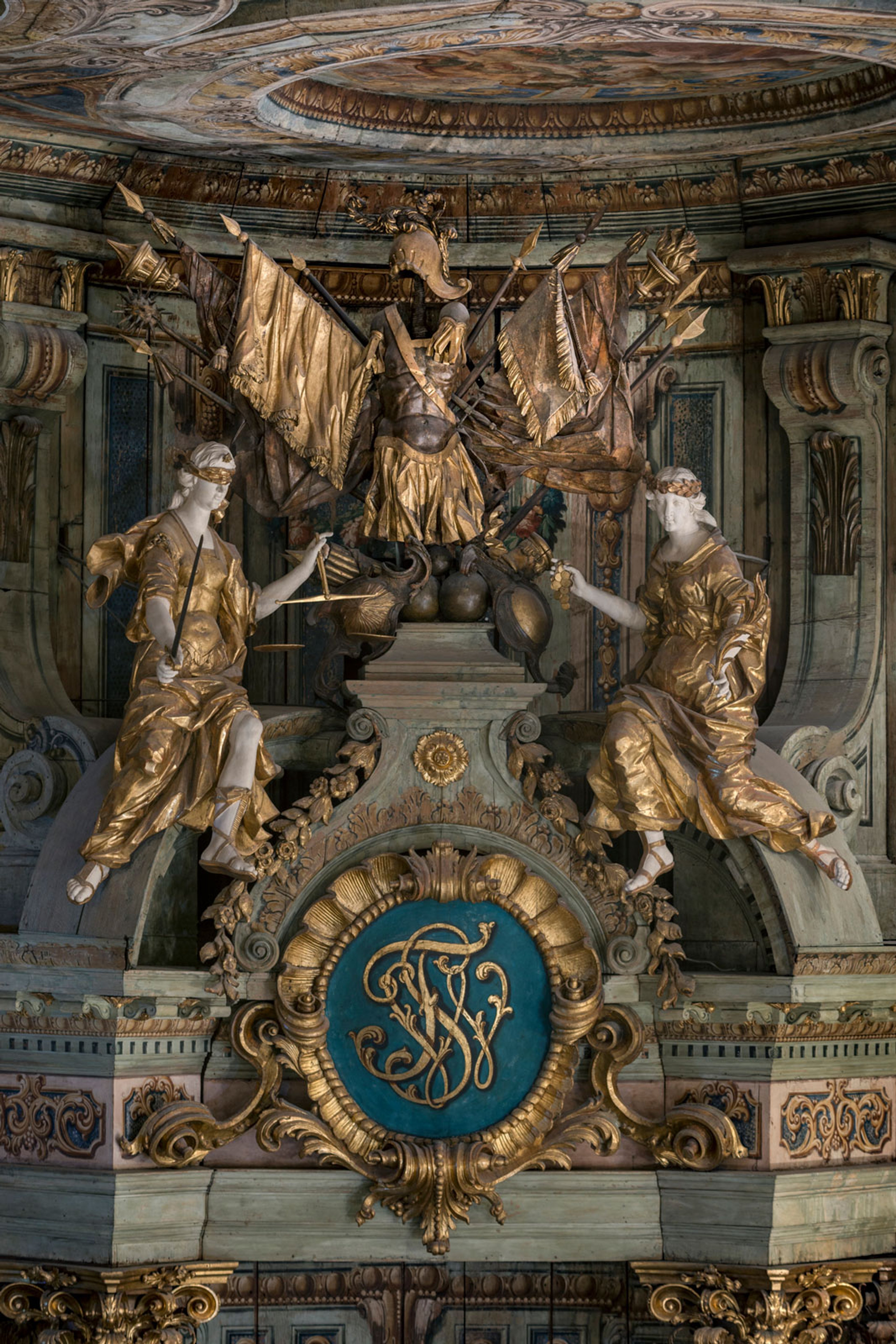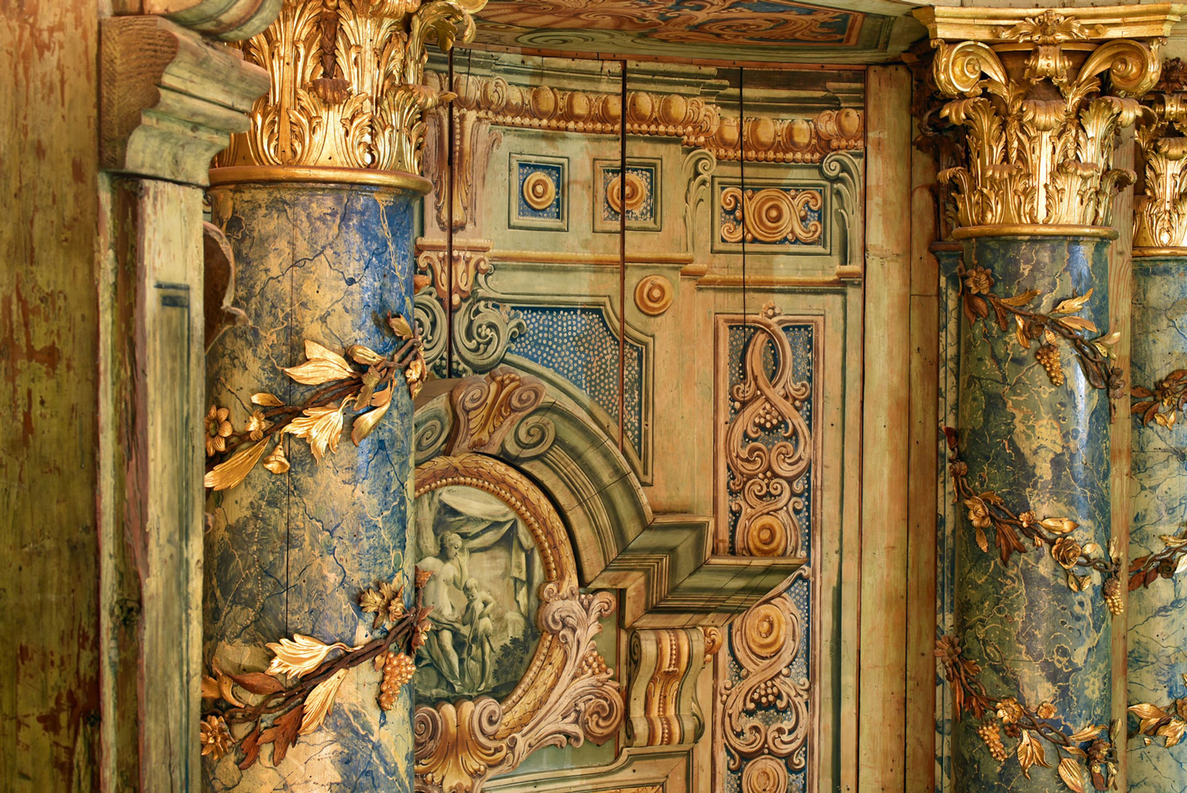 Sections like this view of the columns with grisaille medallion are an example of the Baroque architecture of the time. The aim of the renovation was to conserve rather than reconstruct the building. Conservers were up to 30 in number at times, focusing on removing layers of paint and dirt as well as retouching. This made the building much brighter, as it would have been at the time of Magravine Wilhelmine. Margravial Opera House